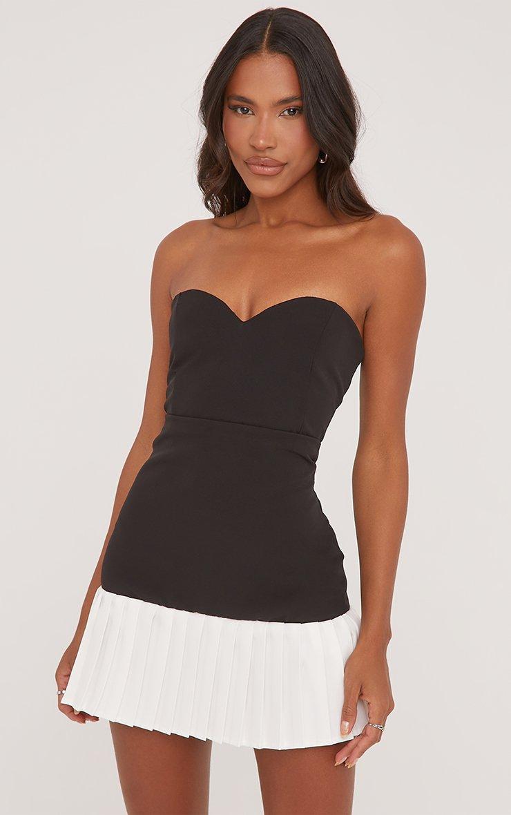 Bandeau Contrast Pleated Mini Dress In Black Woven