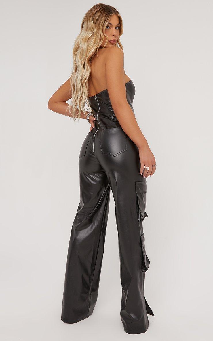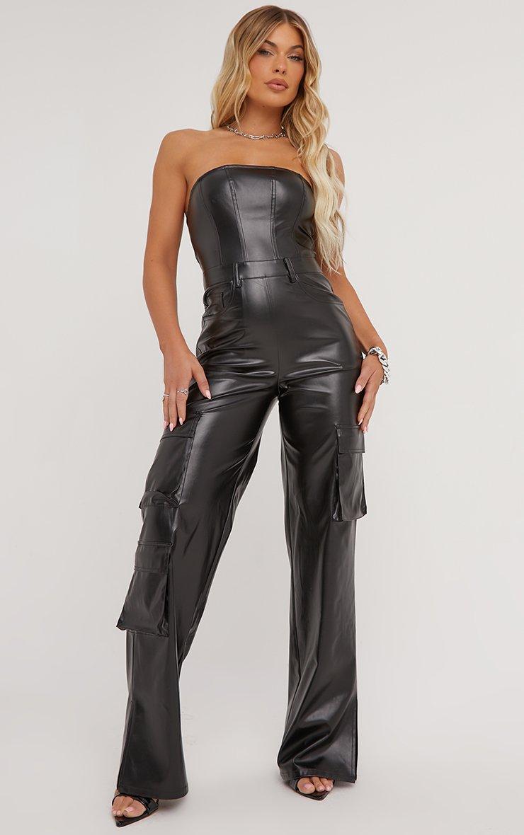 Bandeau Multi Pocket Detail Cargo Jumpsuit In Black Faux Leather