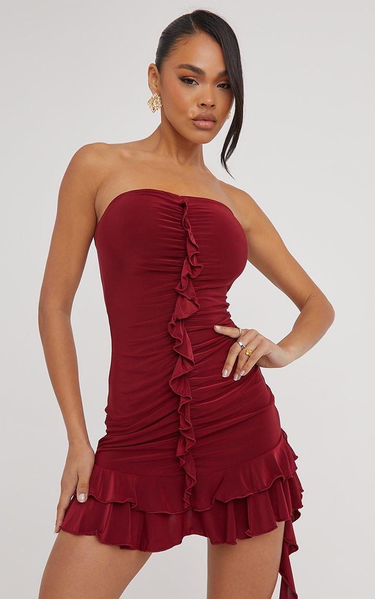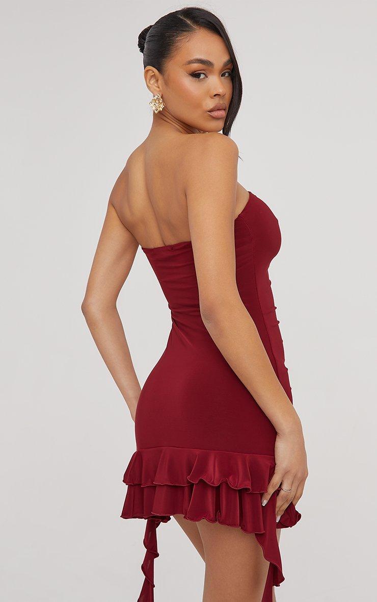Bandeau Ruched Front Frill Hem Detail Mini Dress In Burgundy