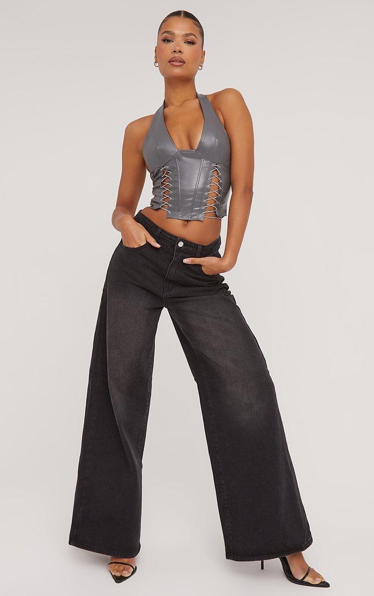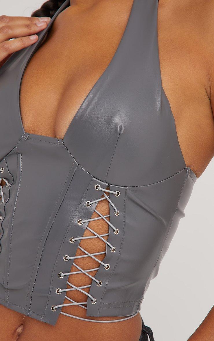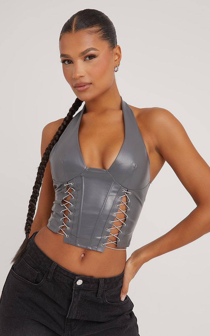 Plunge Halterneck Lace Up Detail Structured Corset Top In Grey Faux Leather