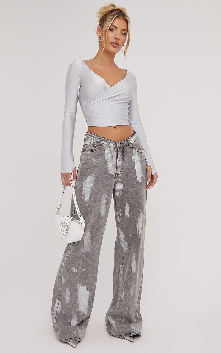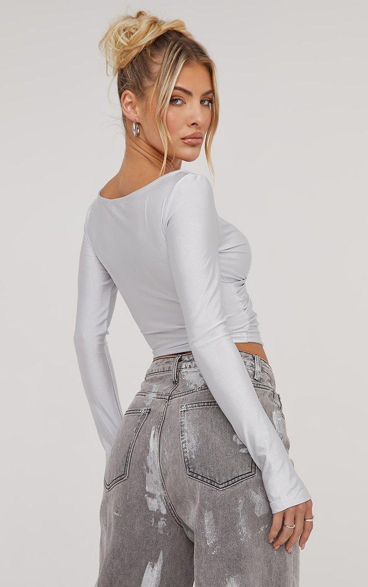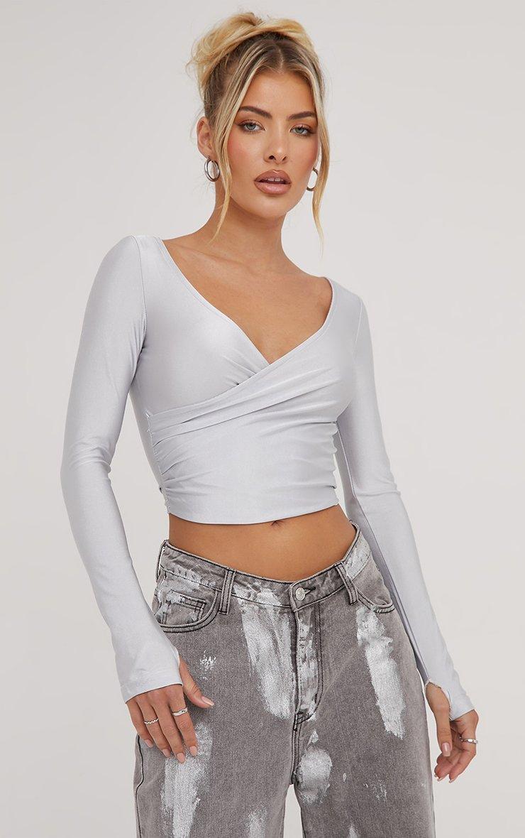 Long Sleeve Wrap Detail Top In Silver Slinky