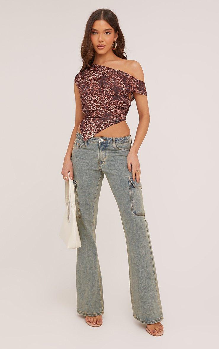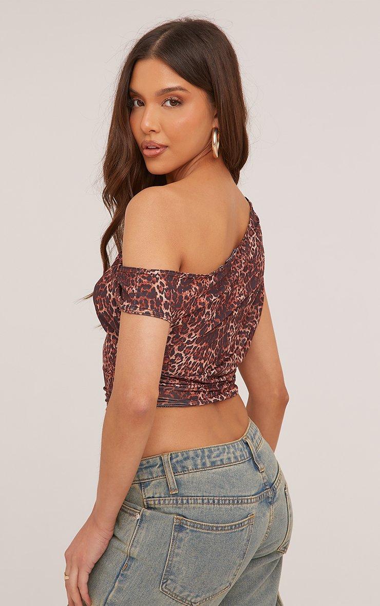 Slouchy One Shoulder Ruched Detail Top In Brown Leopard Print