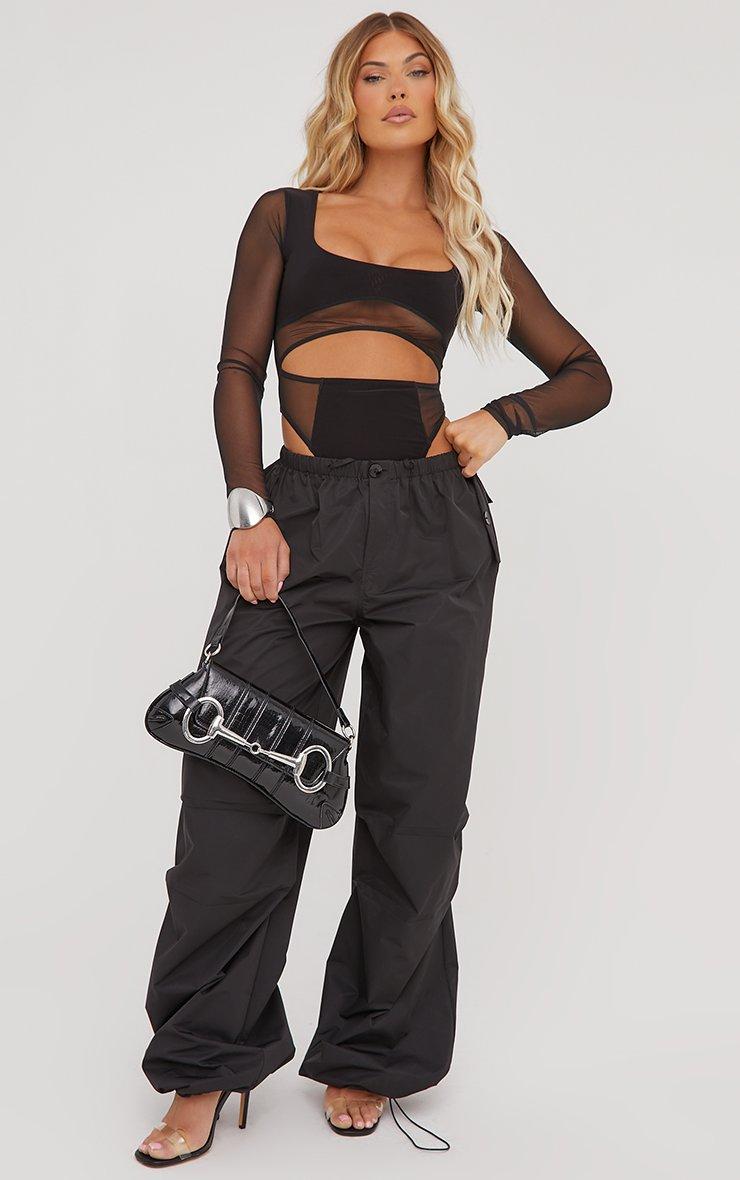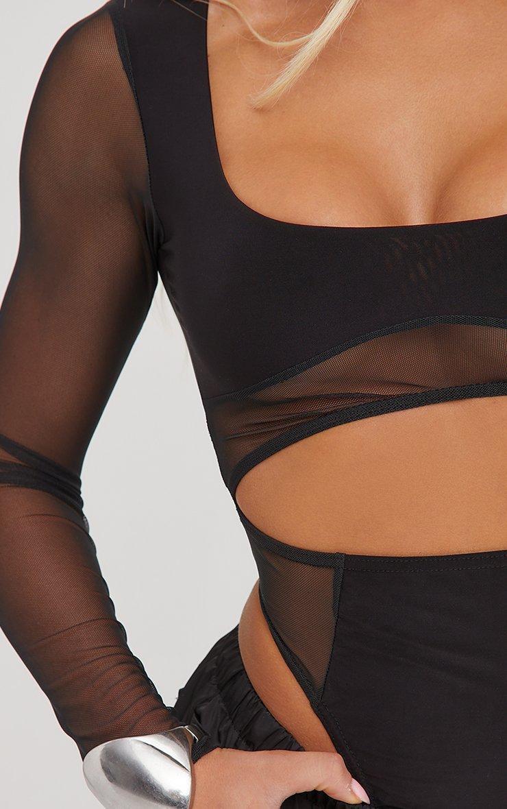Long Sleeve Square Neck Cut Out Front Detail Mesh Contrast Bodysuit In Black Slinky