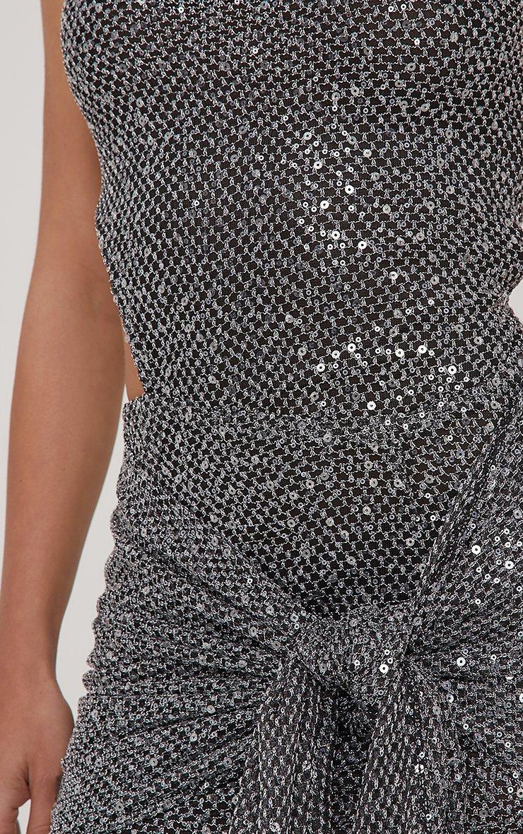 Elevate your party look with this killer dress. Featuring a grey sequin material, a one shoulder, a cut out side, a knotted detail and a mini length.