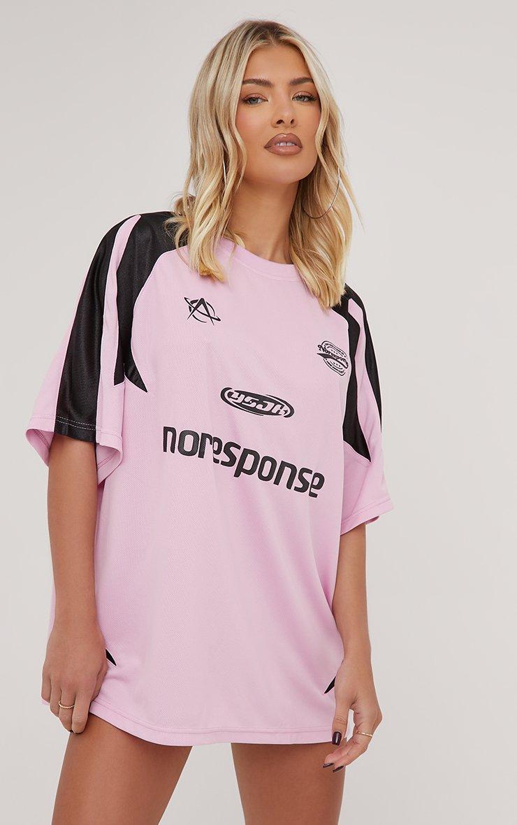Serve sporty chic in our Oversized Contrast Detail Football Jersey Top In Pink. This pink football jerseyâ is cute yet comfy with an oversized fit and graphic print. Shop this football top for your street style!