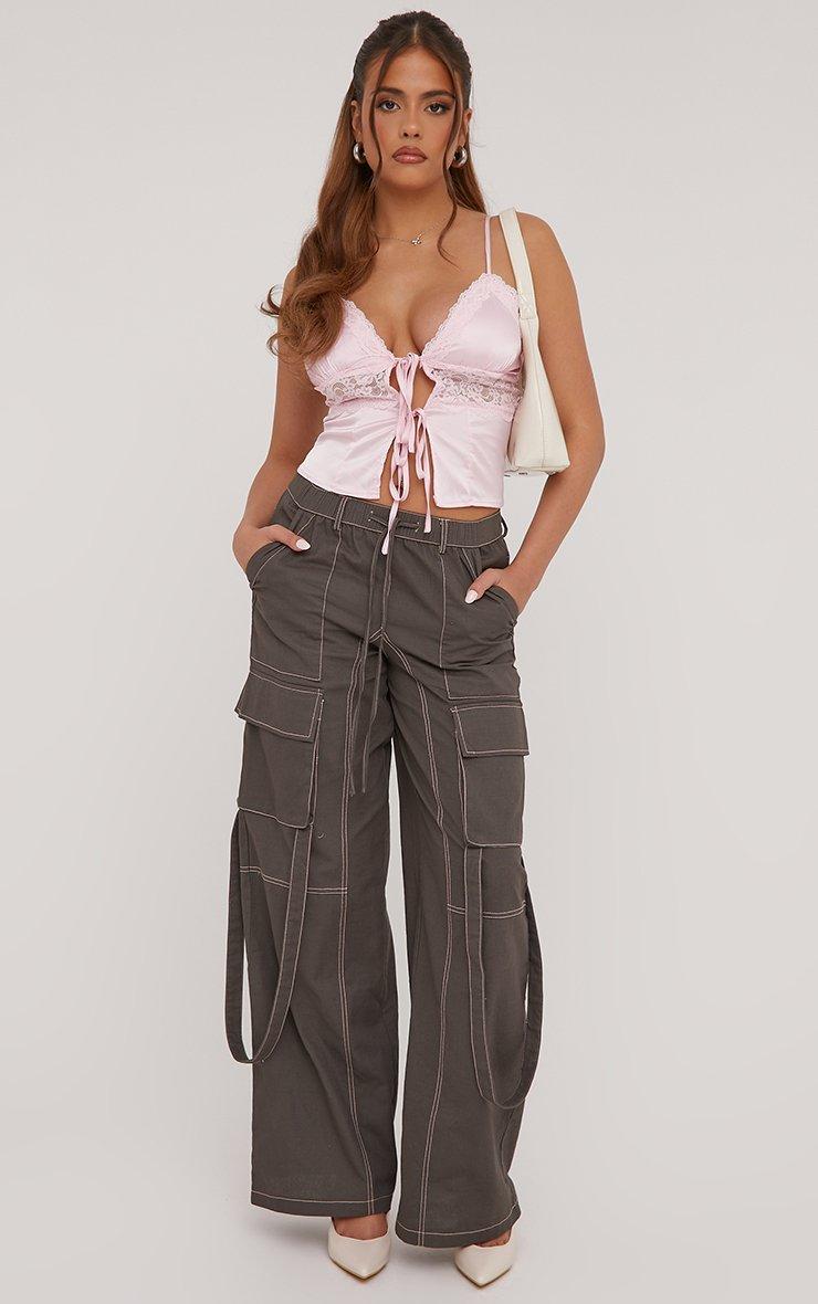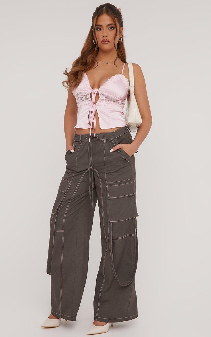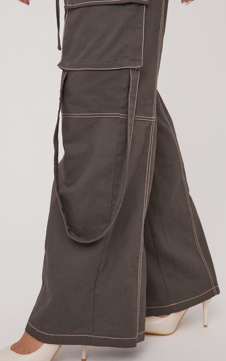 Low Rise Contrast Seam Wide Leg Cargo Trousers In Grey