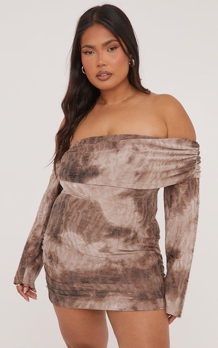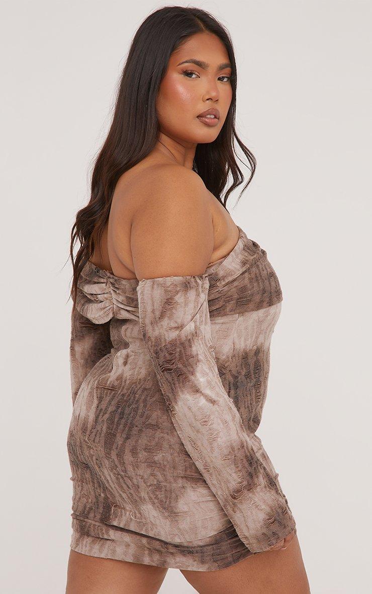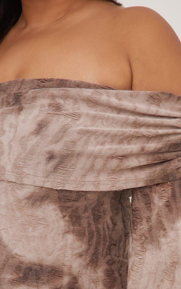 Plus Fold Over Bardot Distressed Mini Bodycon Dress In Mauve Acid Wash Woven