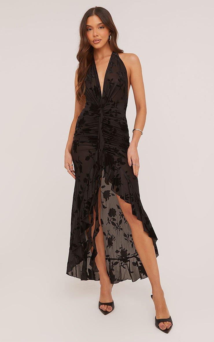 Plunge Halterneck Frill Detail Maxi Dress In Black Floral