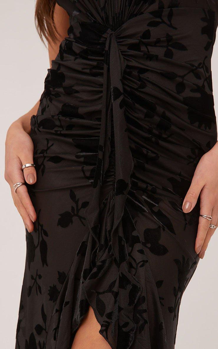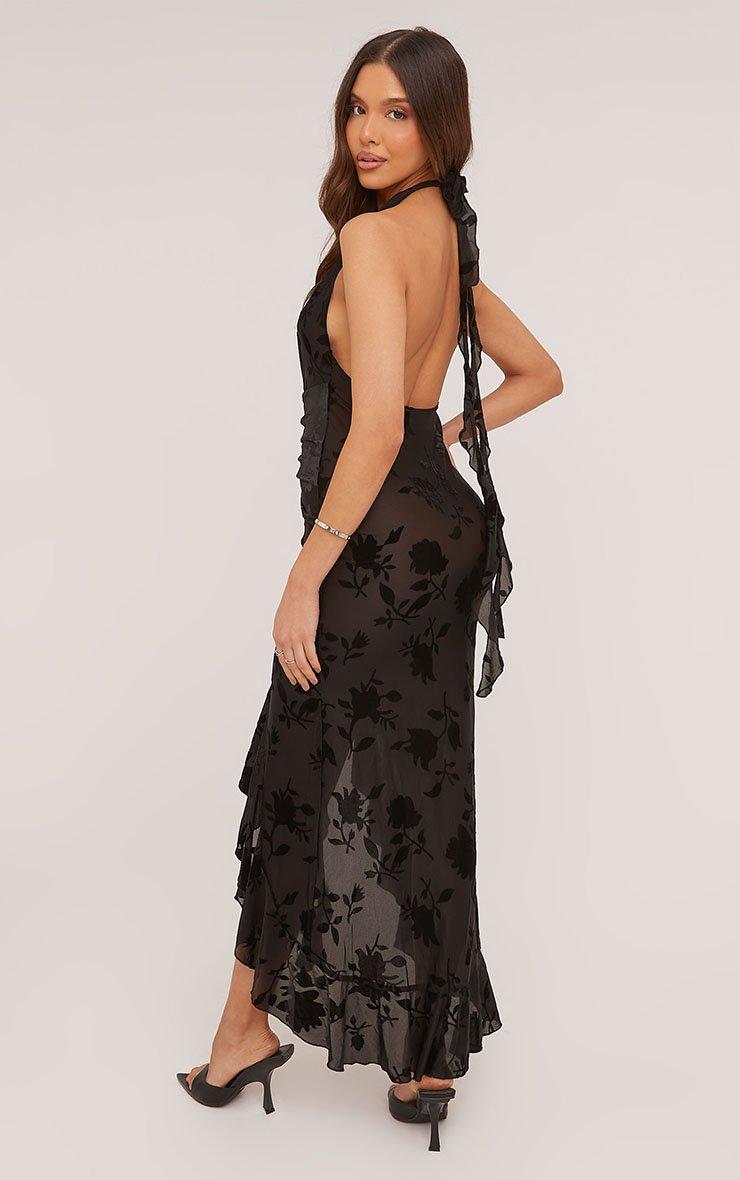 What more could you want with this dress doll. Featuring a black floral material, a plunge halterneck, a frill detail and a maxi length.