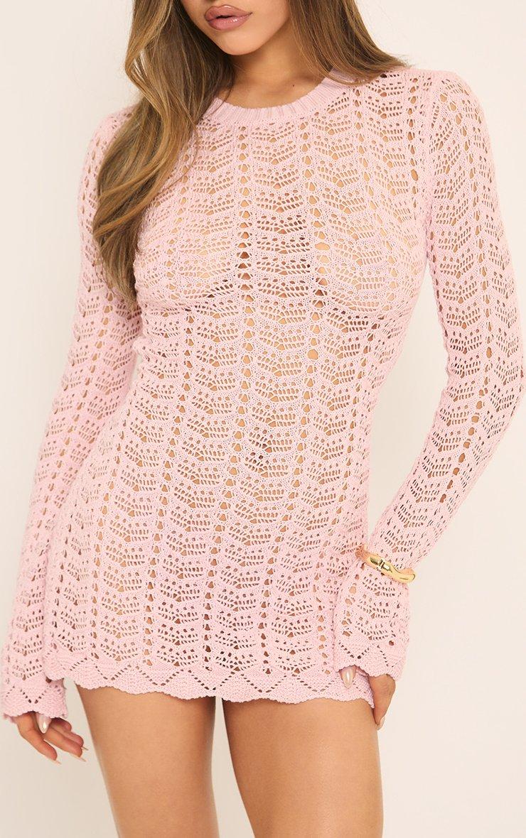 Turn heads, doll. This pink crochet-knit mini bodycon dress features a long sleeve design with a tie open back for that extra dose of sass. Perfect for making a bold statement at any night out!
