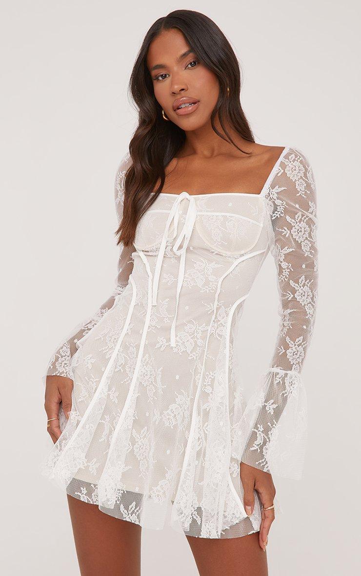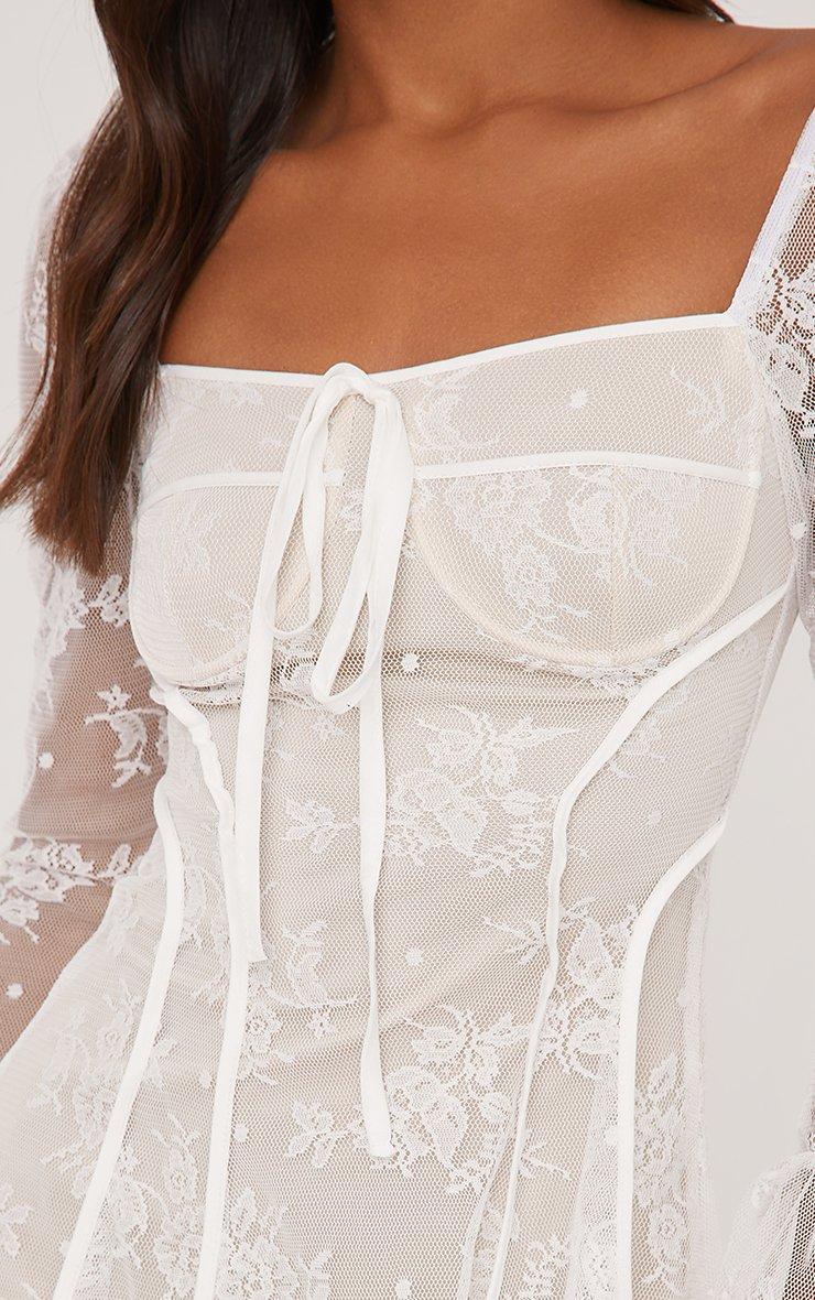 Long Sleeve Square Neck Seam Detail Flippy Hem Mini Dress In White Lace
