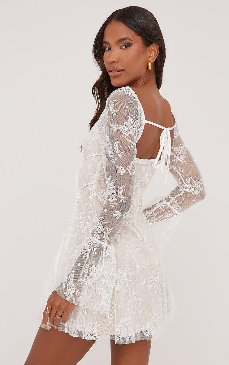 This chic dress is just what your wardrobe is missing doll. Featuring a white lace material, long sleeves, a square neck, seam detail, flippy hem and a mini length.