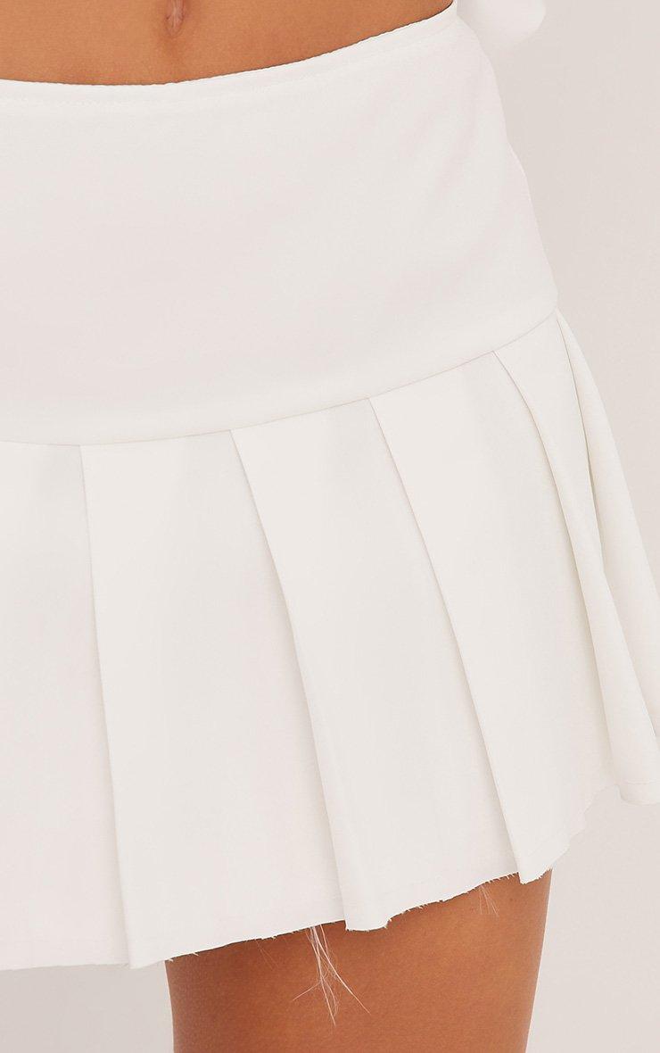 This skirt is a summer must have. Featuring a white material, a low rise, a raw edge, pleated design and a mini length.