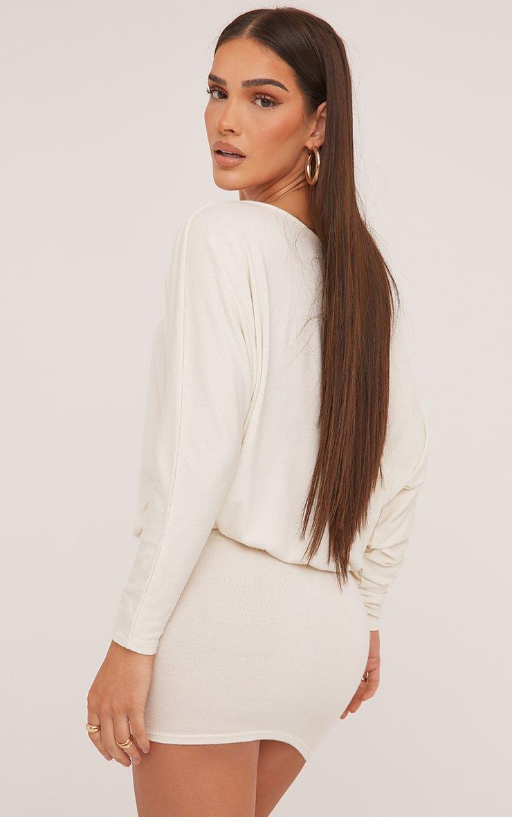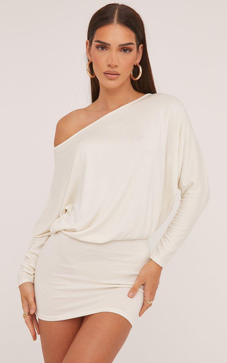 Off The Shoulder Batwing Mini Dress In Stone Brushed Rib