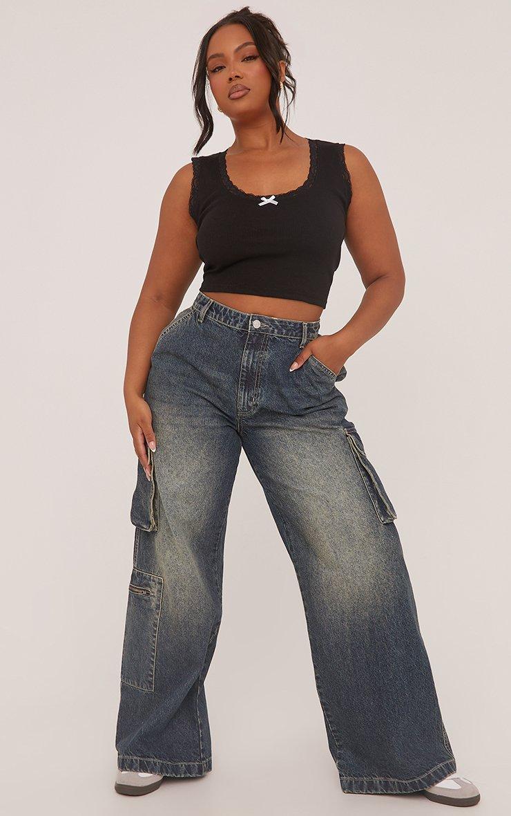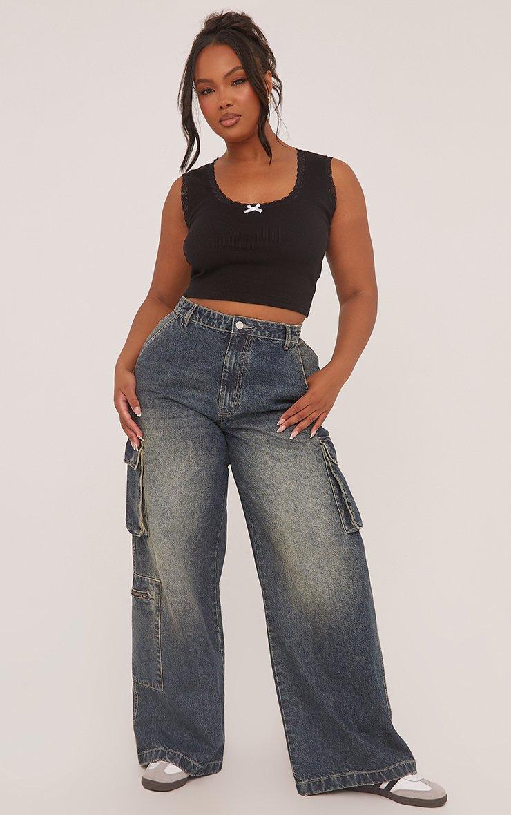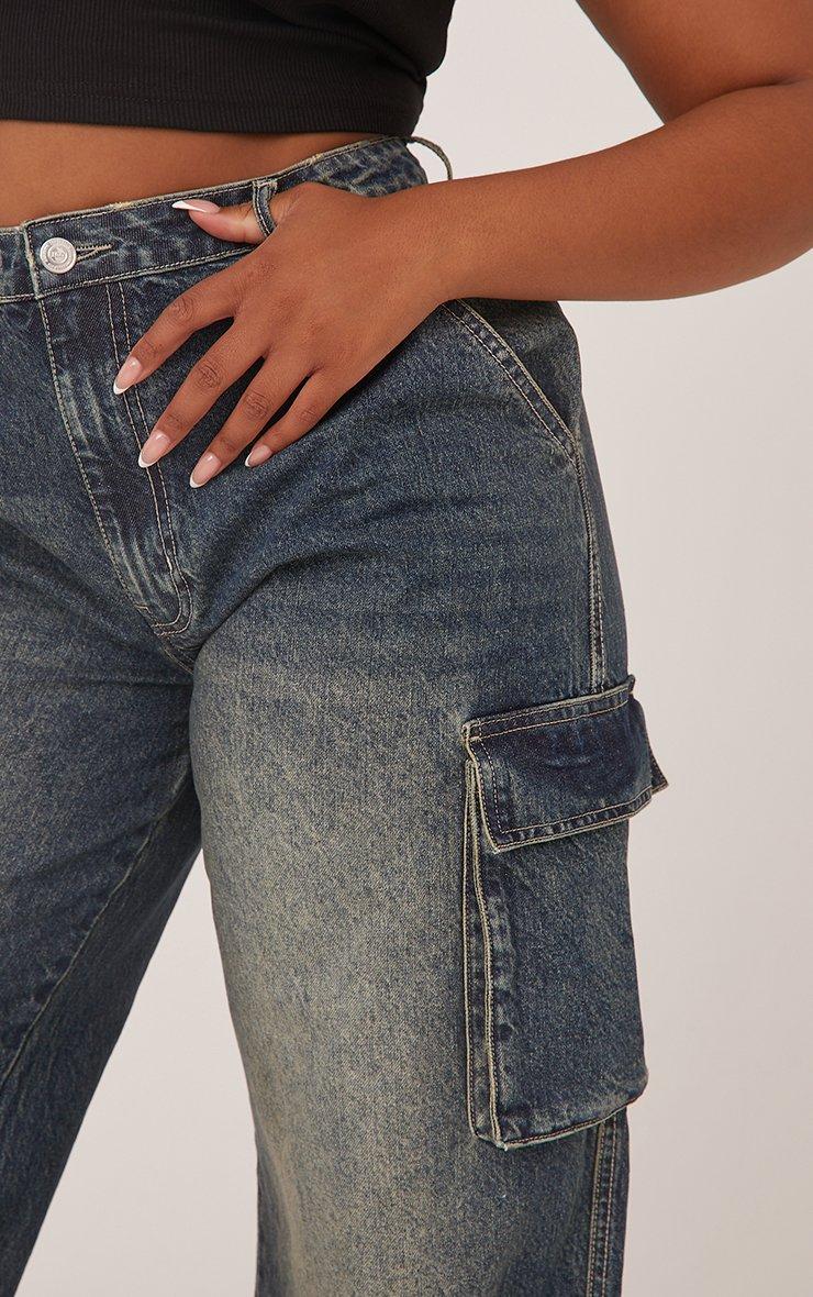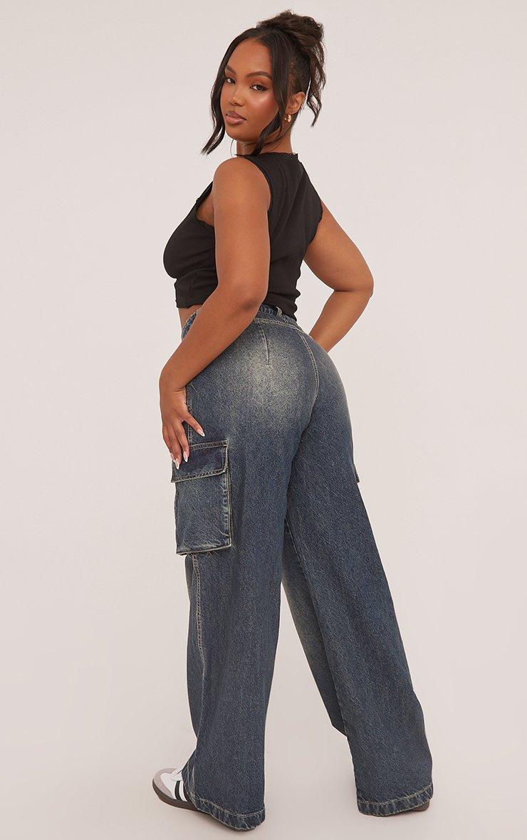 Plus High Waist Wide Leg Cargo Jeans In Blue Vintage Washed Denim