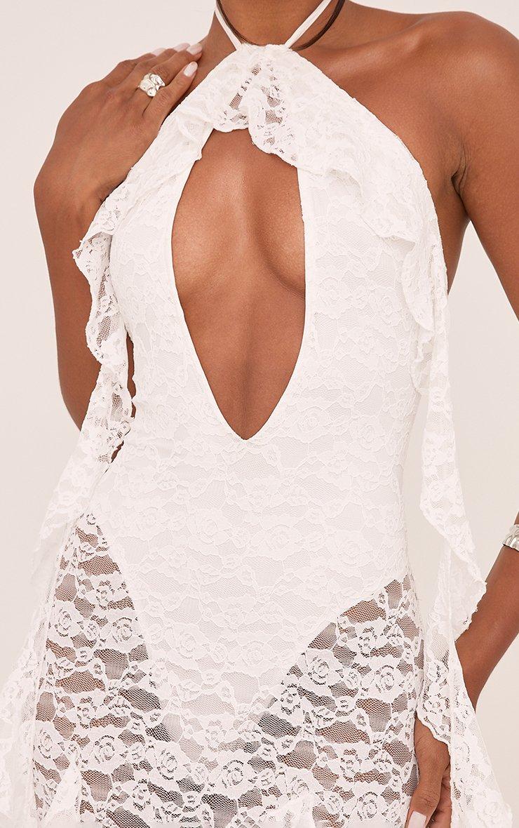 Halterneck Keyhole Cut Out Frilly Maxi Dress In White Lace