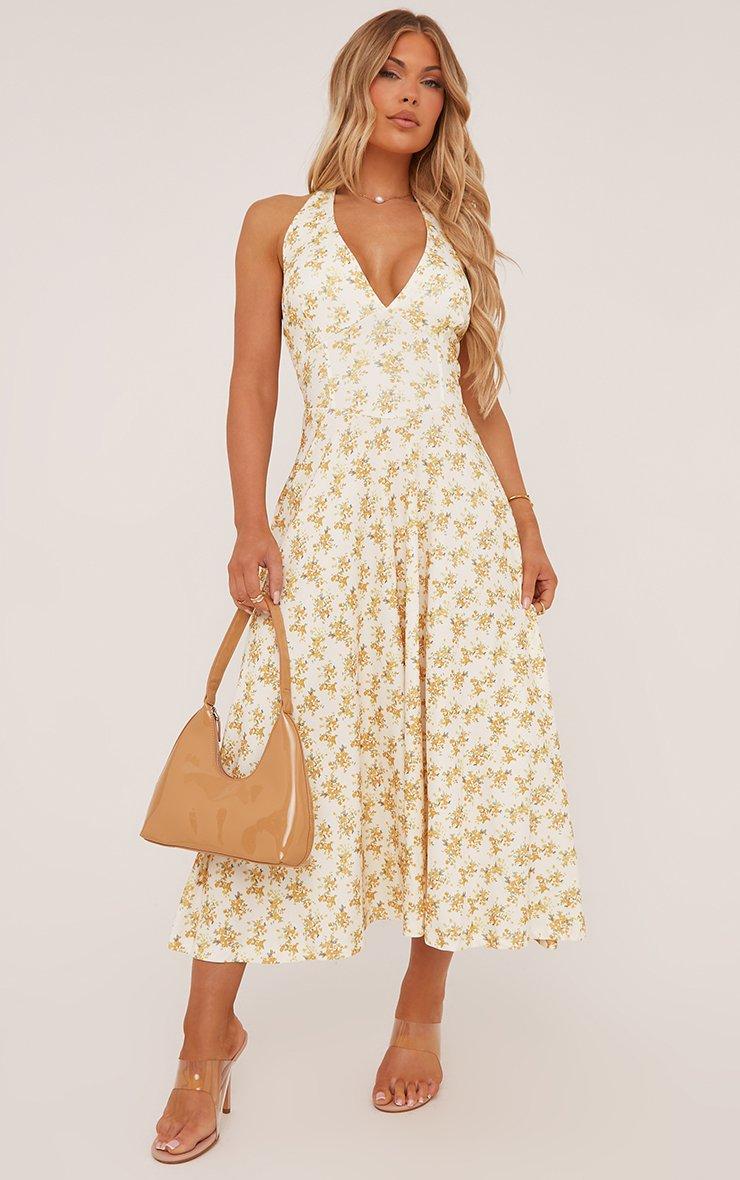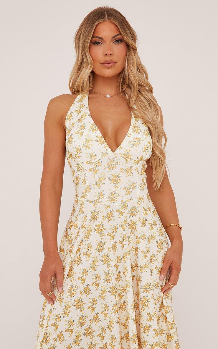 Plunge Halterneck A Line Maxi Dress In Yellow Floral Print Woven