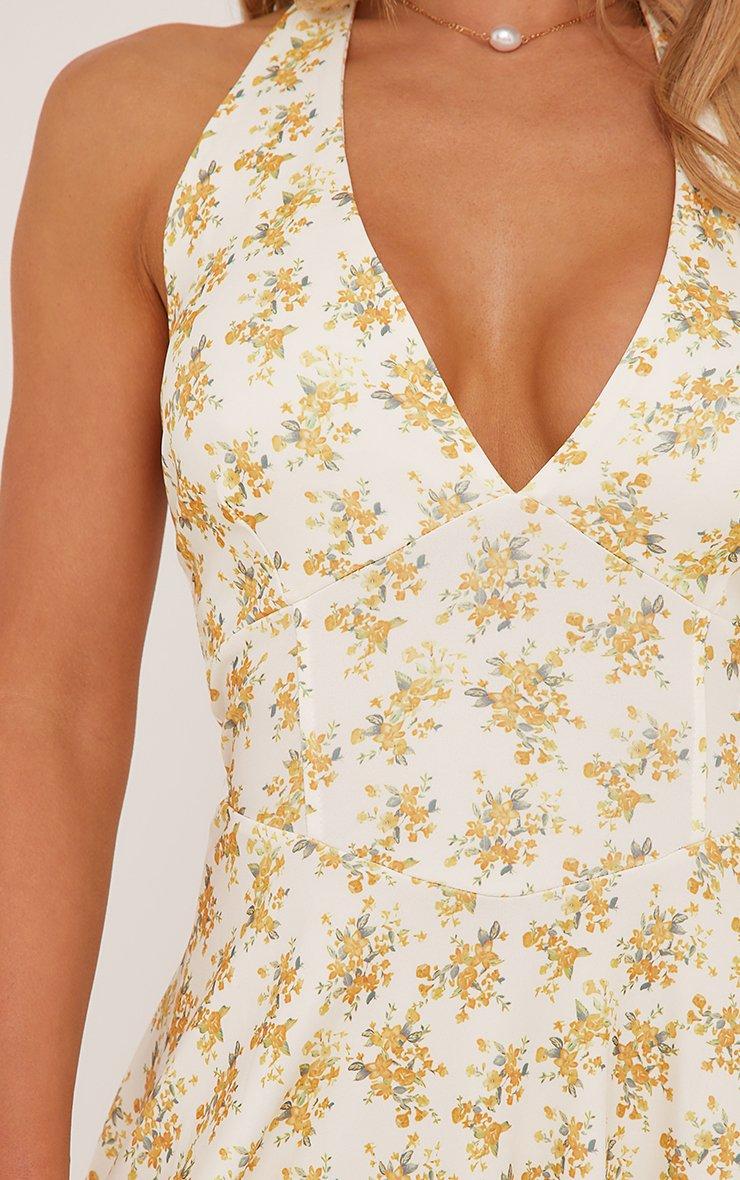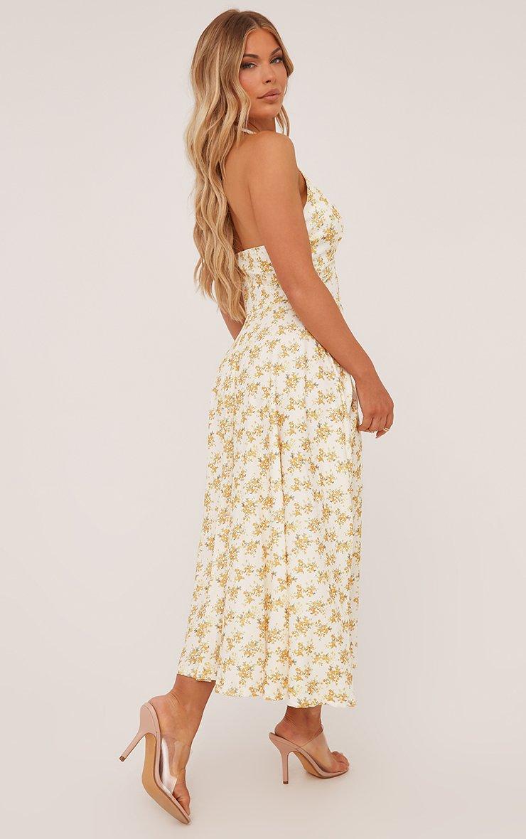 This dress is a summer must have doll. Featuring a yellow floral print woven material, a plunge halterneck and an a line maxi length.