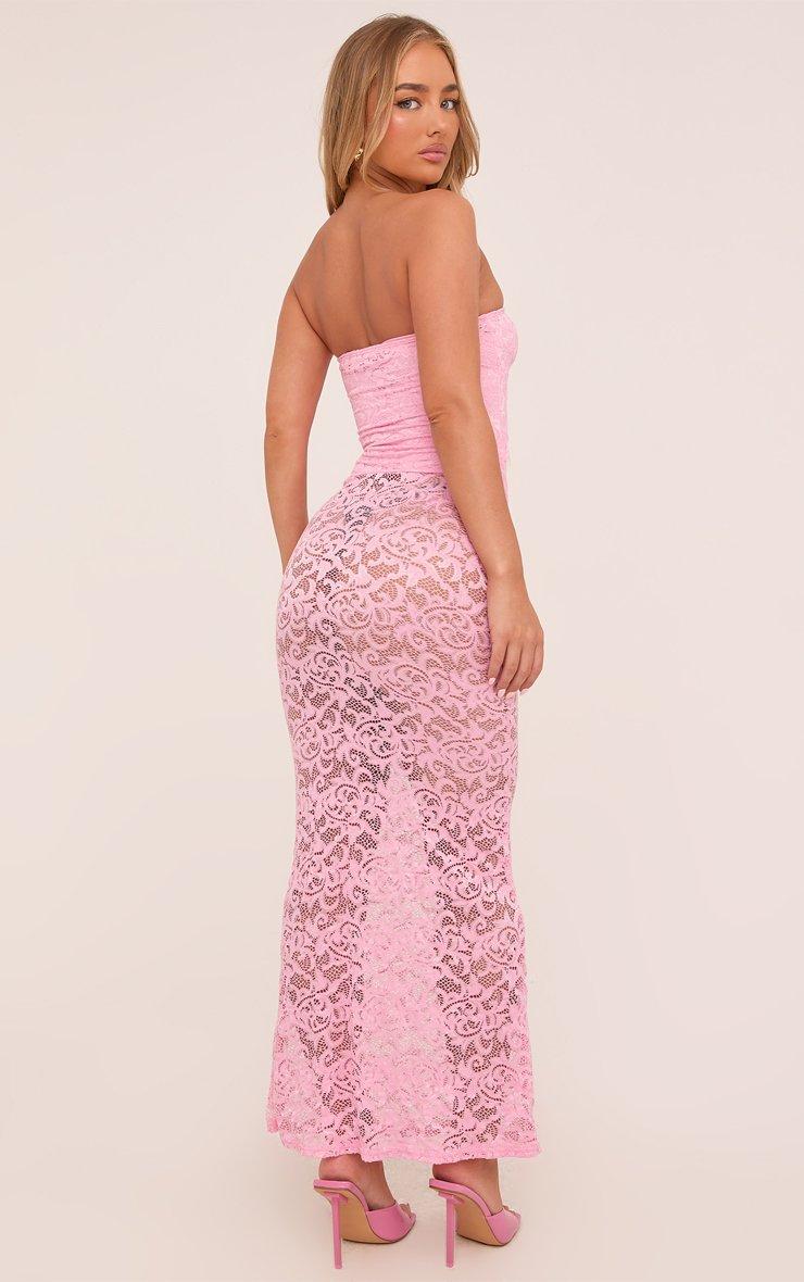 Elevate your summer wear with this dress. Featuring a pink lace material, a bandeau neck, a ring detail, a cut out and a maxi length.