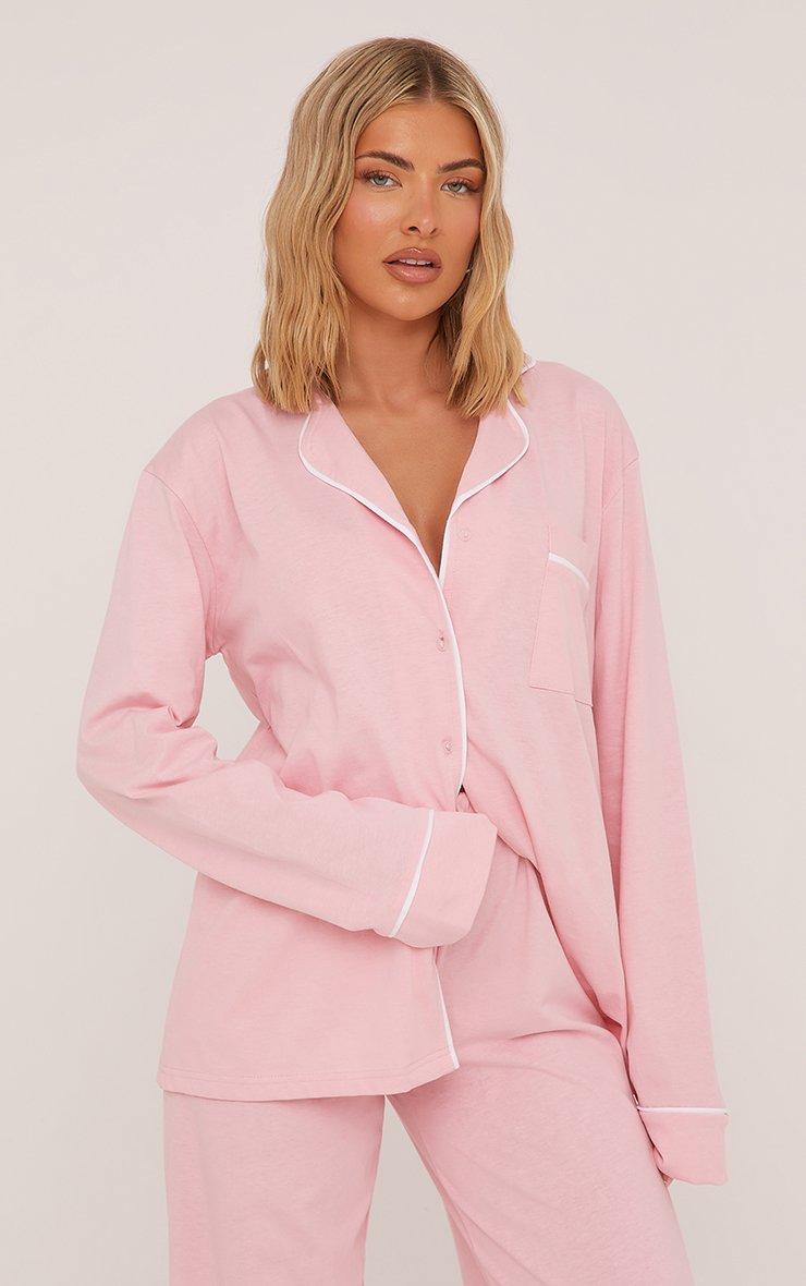 Have the perfect night in with these pyjamas. Featuring a pink material, contrast piping, a long sleeve shirt and straight leg trousers.