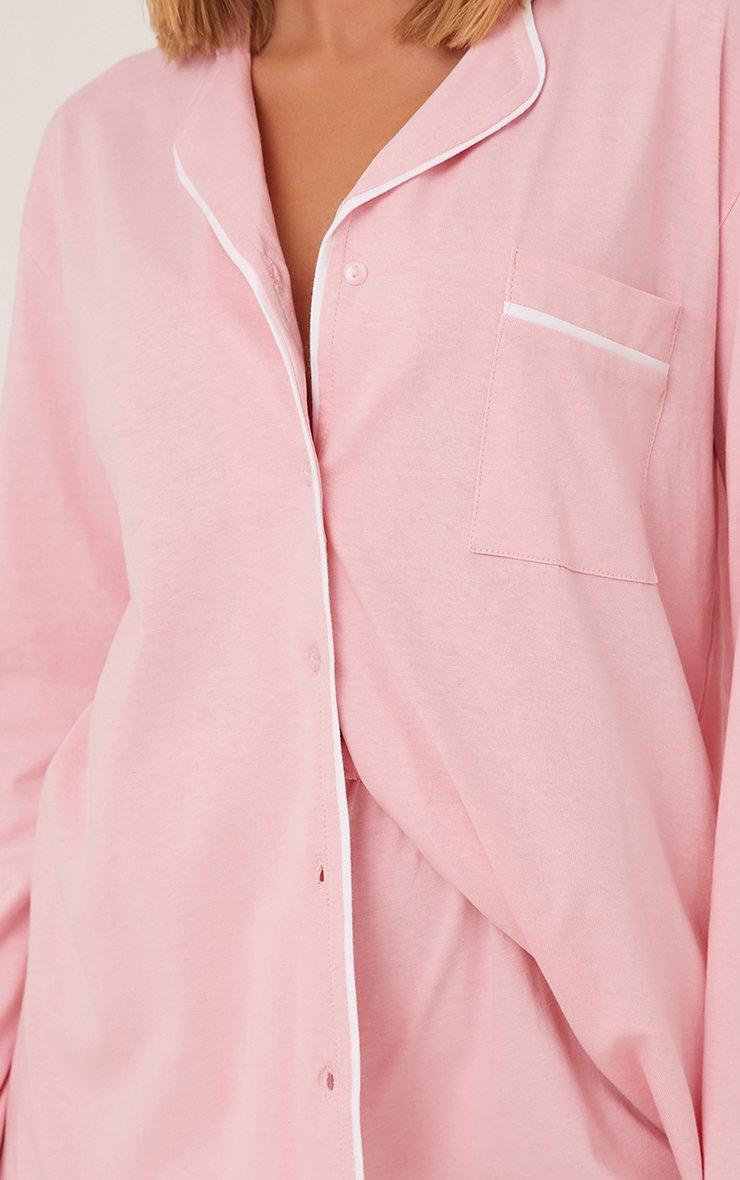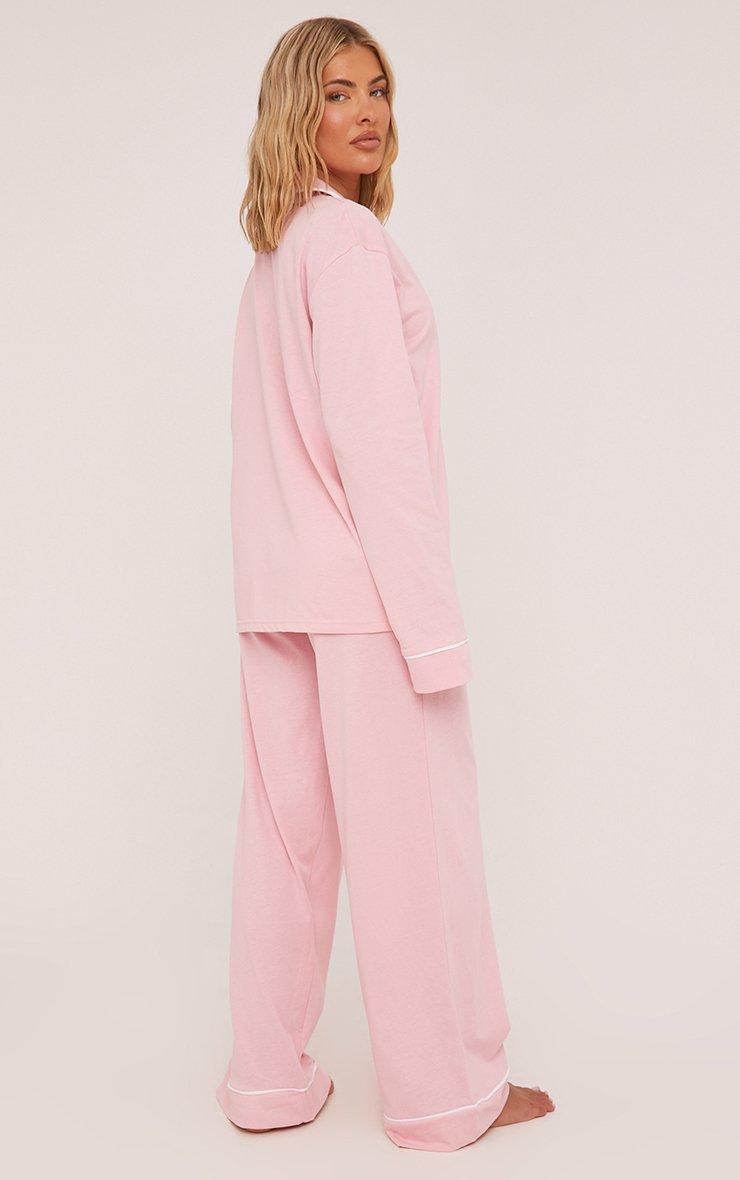 Contrast Piping Long Sleeve Shirt And Straight Leg Trousers Pyjama Set In Pastel Pink