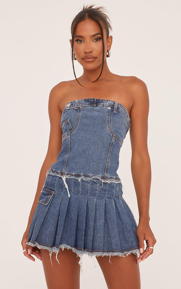 Add a denim twist to your summer wardrobe with this dress. Featuring a blue denim material, a bandeau neck, a distressed detail, pleated details and a mini length.