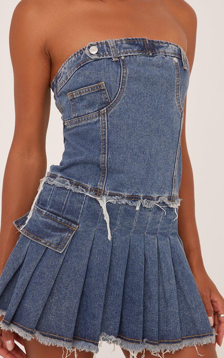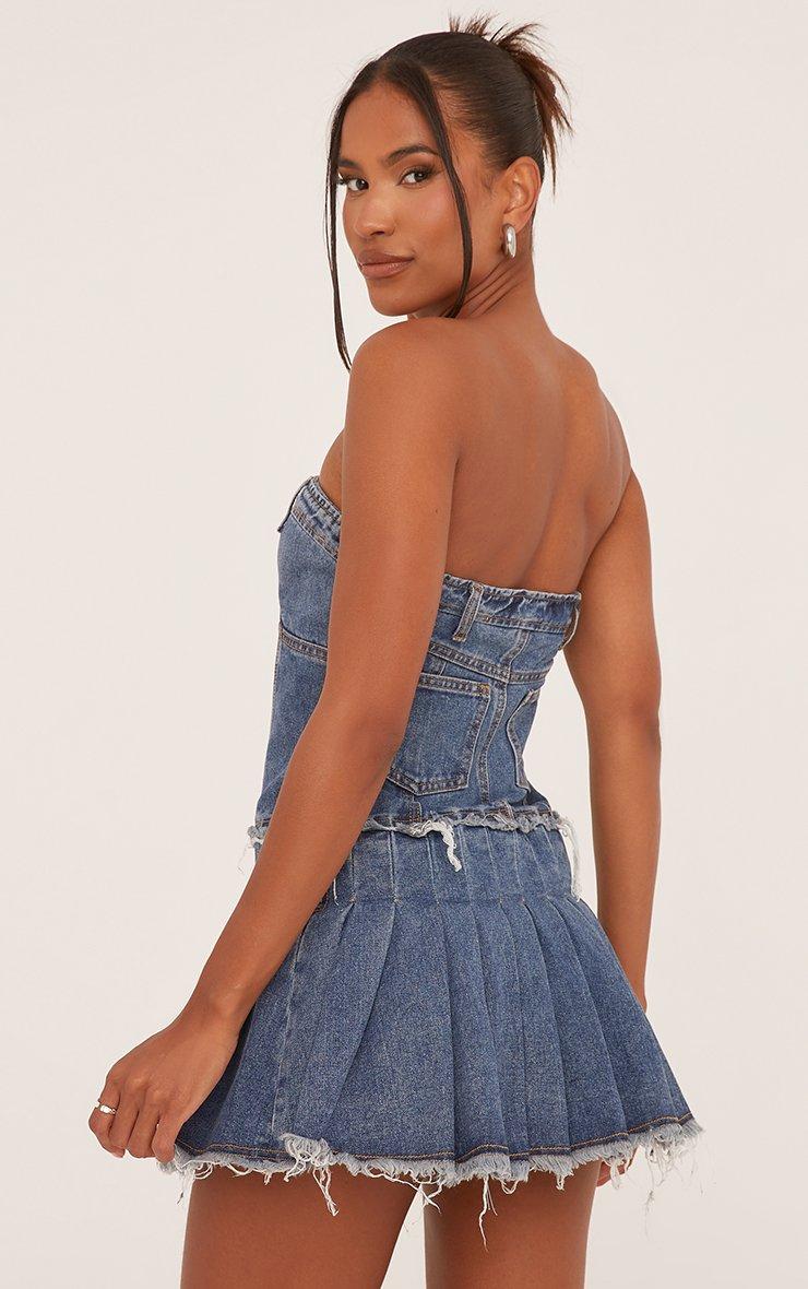 Bandeau Distressed Detail Pleated Mini Dress In Blue Denim