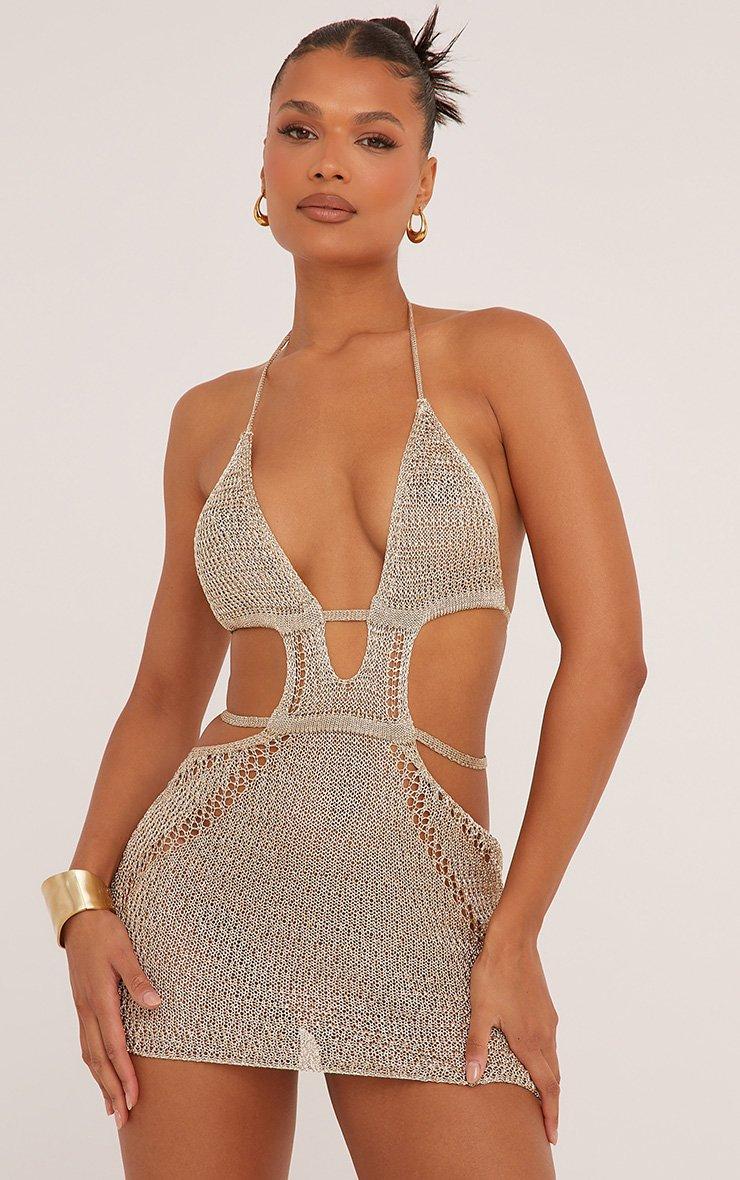 Say yes to this dress. Featuring a gold metallic knit material, a plunge neckline, cut out detailing and a mini length.