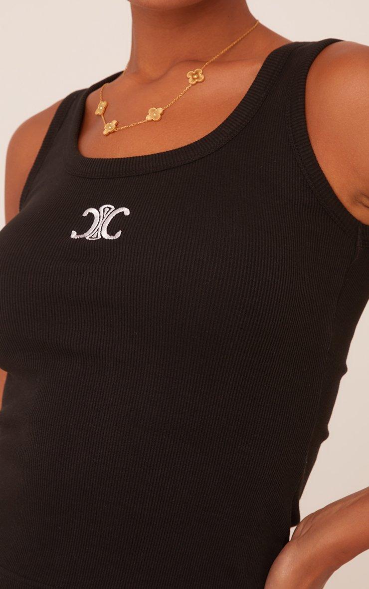 Stay effortlessly on-trend with this Scoop Neck Logo Vest Top In Black Rib. This black rib vest top is all about that chic, simple style with its flattering scoop neck and soft, black rib fabric. The bold logo adds a luxe, high-end vibe that’s all about adding a dash of style to your everyday look. Pait this vest top with your fave jeans, trainers and sunnies for a fierce off-duty model vibe!