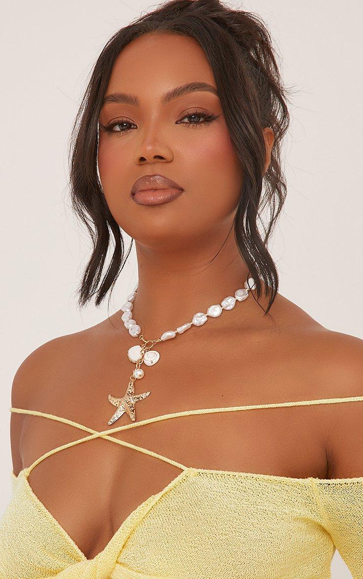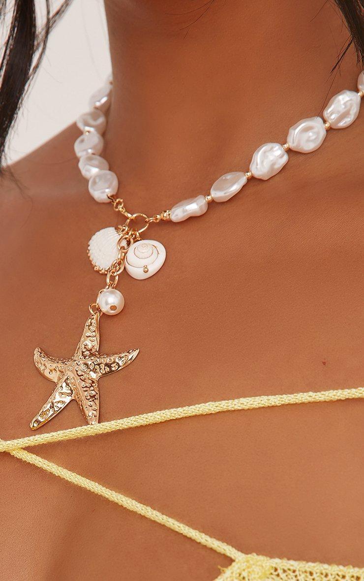 This necklace is giving all the beachy girl vibes. featuring a gold material, pearl beads and a starfish detail.