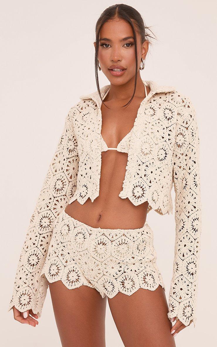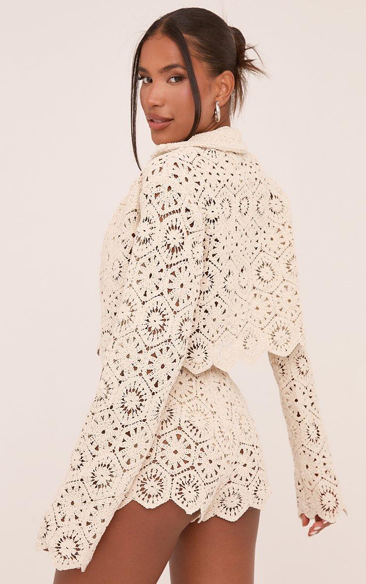 This crochet shirt will always have you looking best dressed, style it your way or with the matching shorts for a flawless look without fail. Featuring a stone crochet knit material, long sleeves and a cropped length.