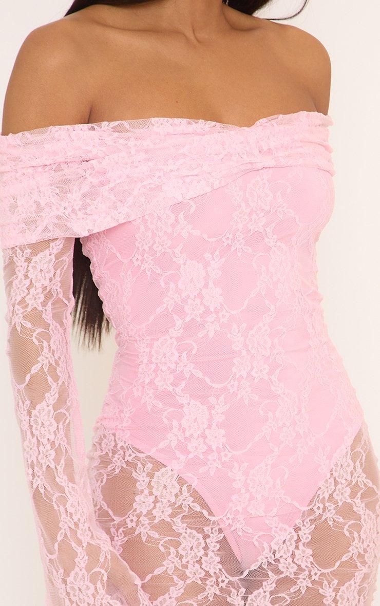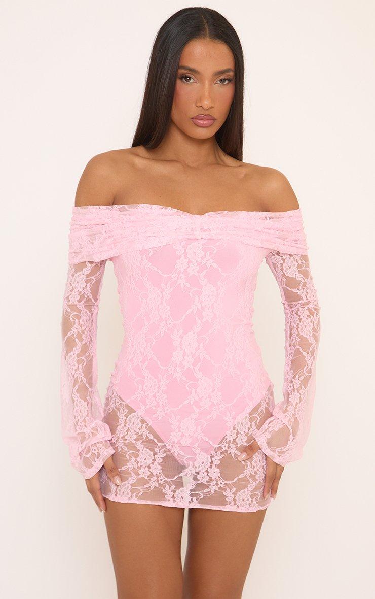 Long Sleeve Bardot Foldover Ruched Bodysuit Lining Mini Dress In Pink Lace