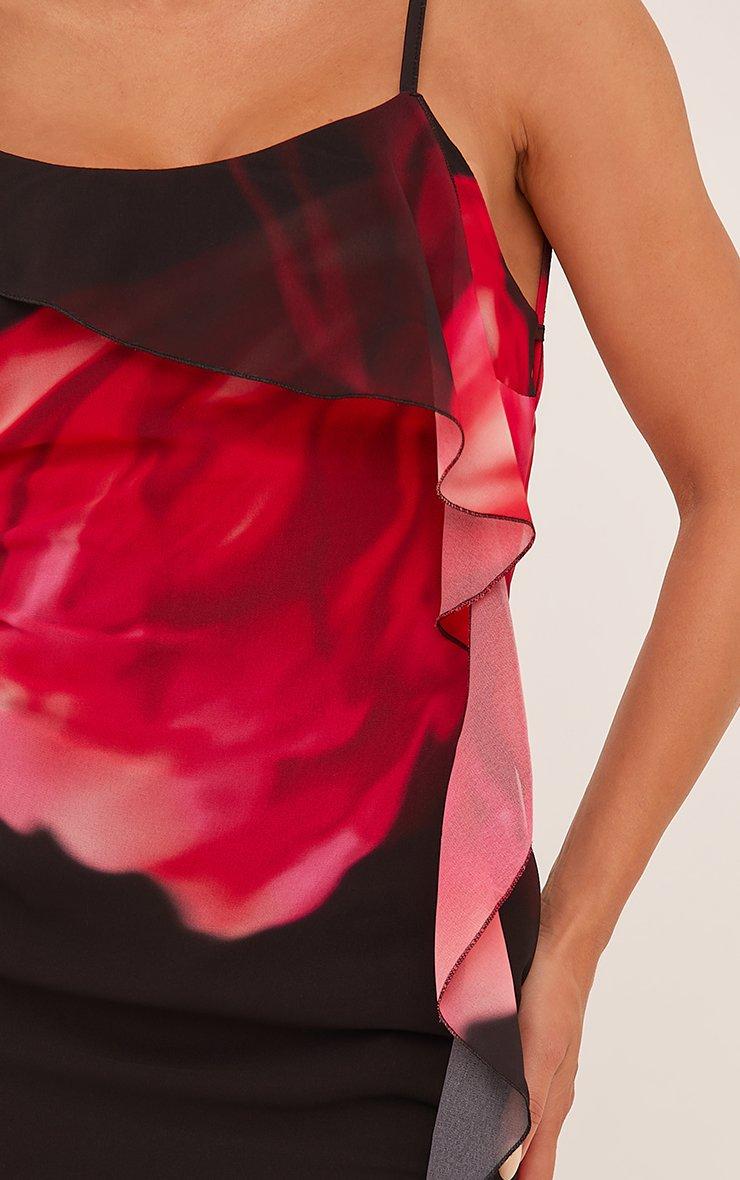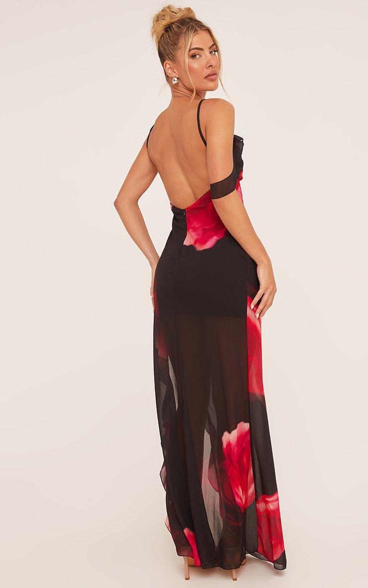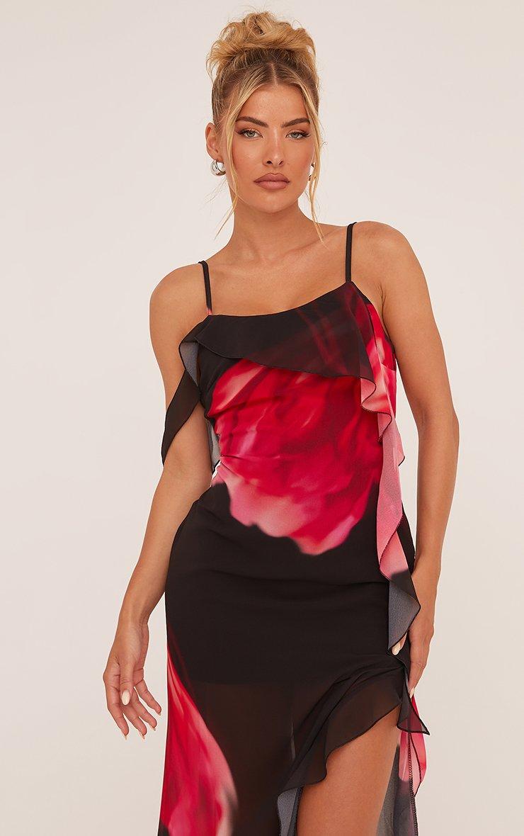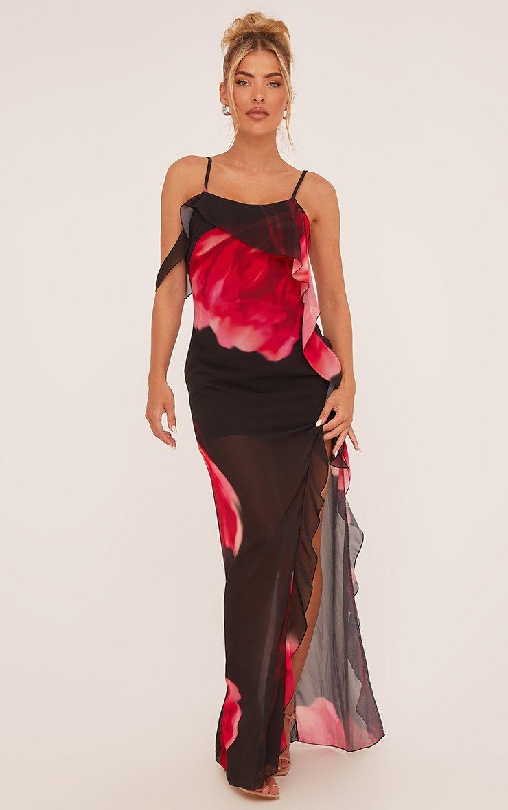 Make those evening plans doll, we have your outfit sorted. Featuring a black floral print mesh material, strappy details, a frill detail, a split leg and a maxi length.
