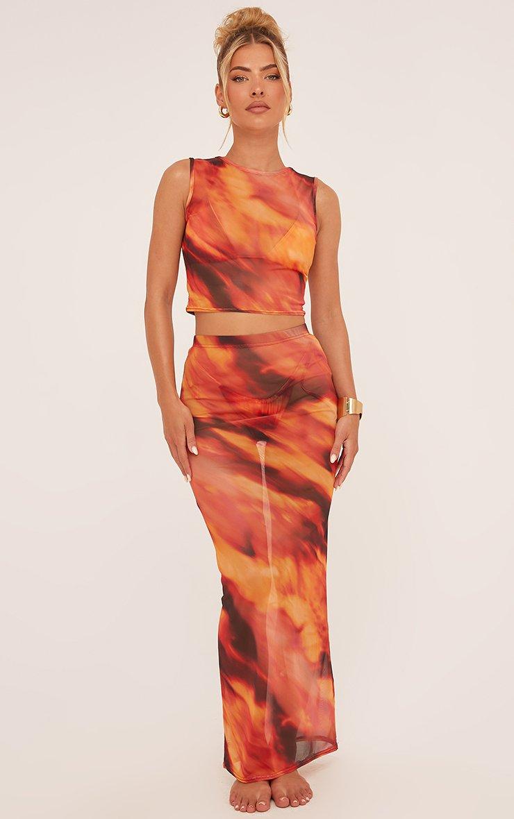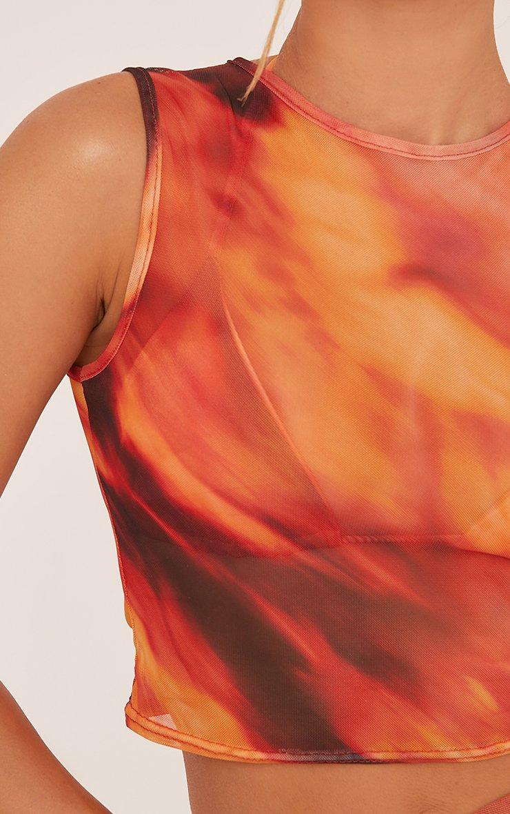 Grab this top before your next beach trip doll. Featuring an orange abstract print material, a sleeveless design and a cropped length.