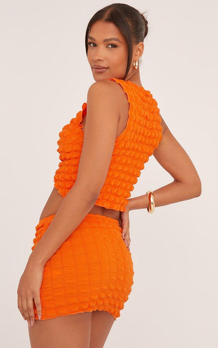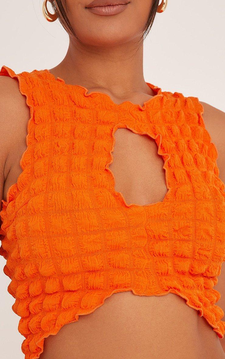Catch everyone's eyes in this top. Featuring an orange bubble textured material, a keyhole cut out and a cropped length.