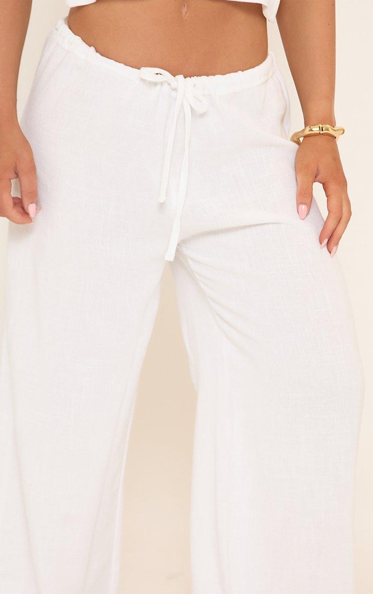 Low Rise Tie Waist Wide Leg Detail Trousers In White Linen