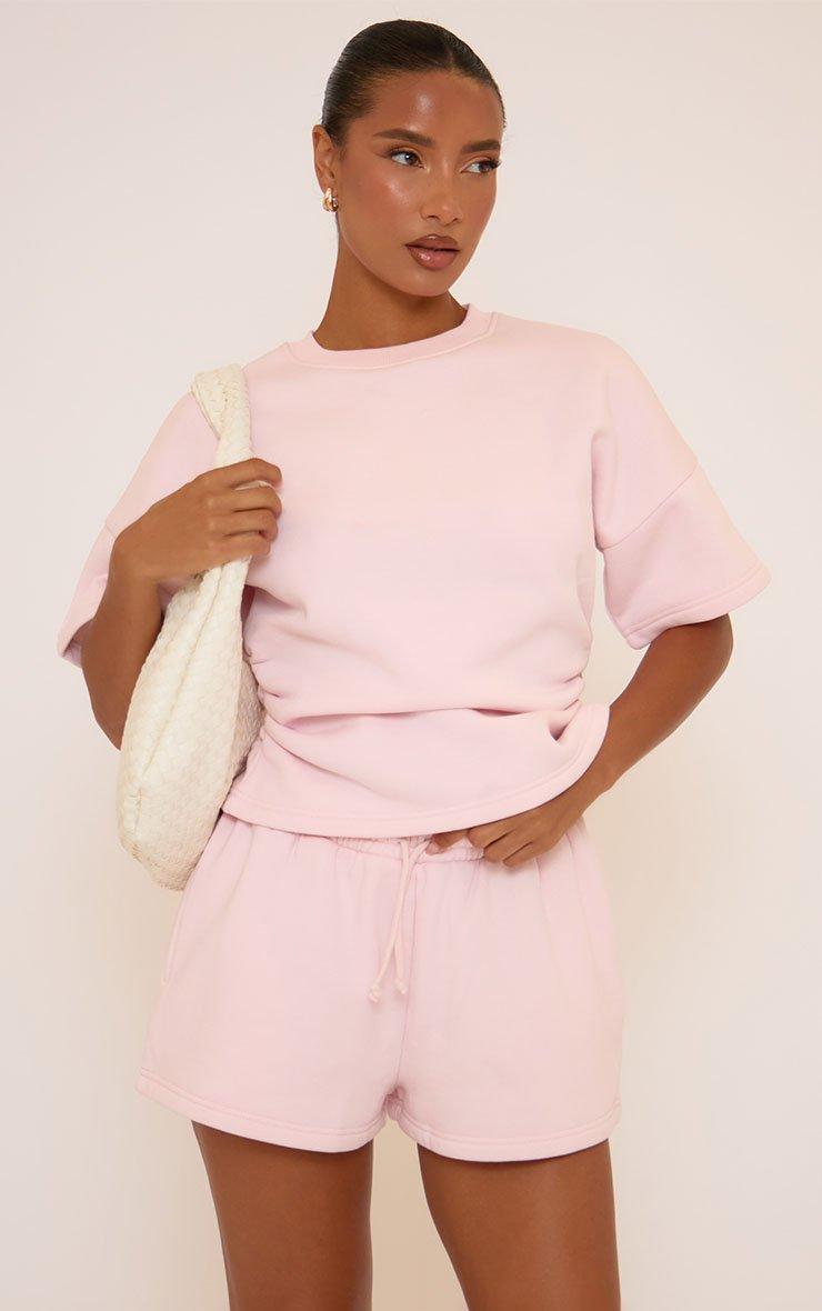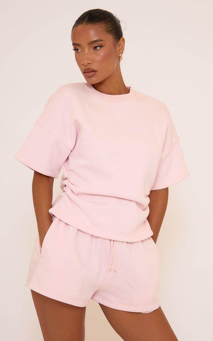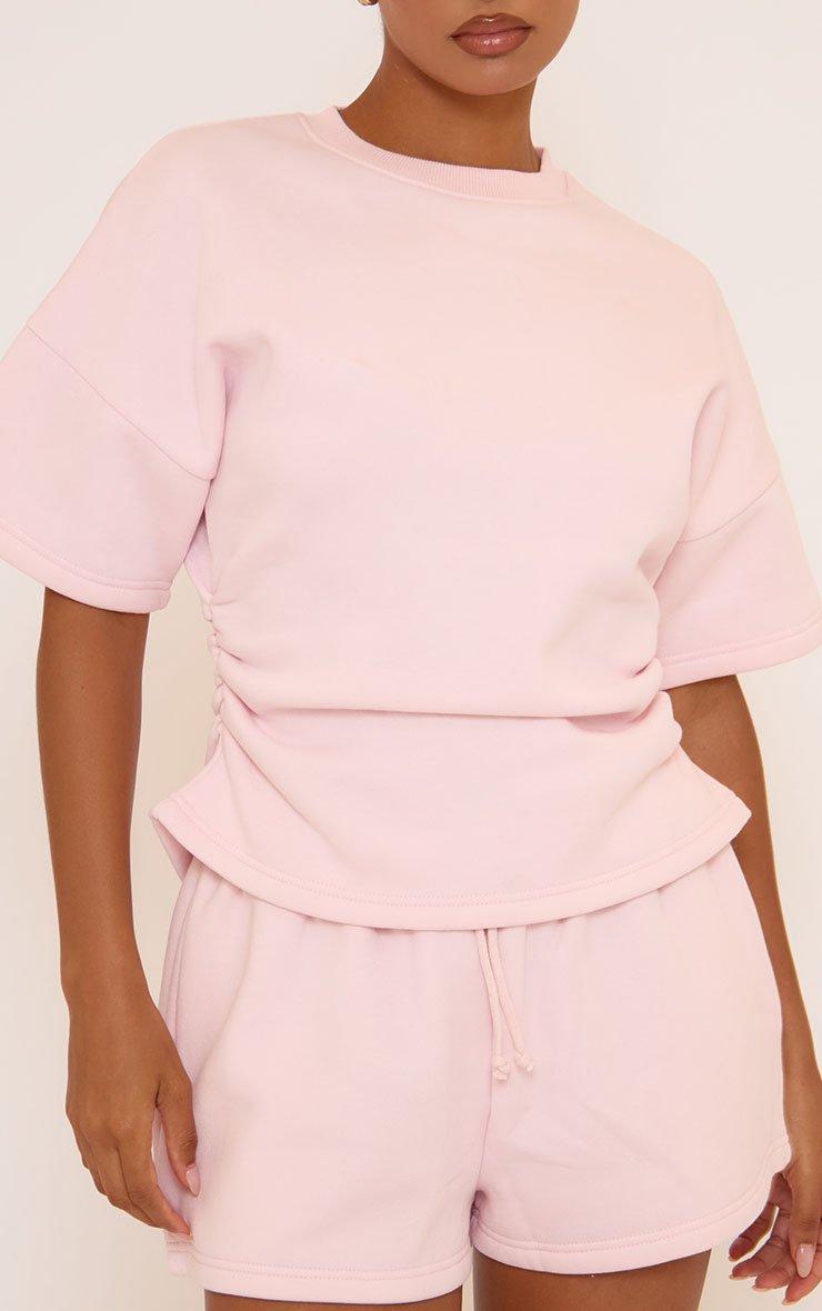 Short Sleeve Cinched Waist Detail Ruched Sweat Top In Pink