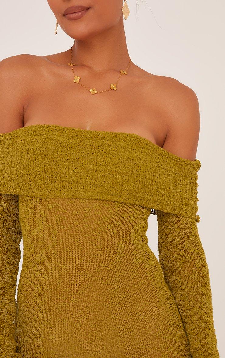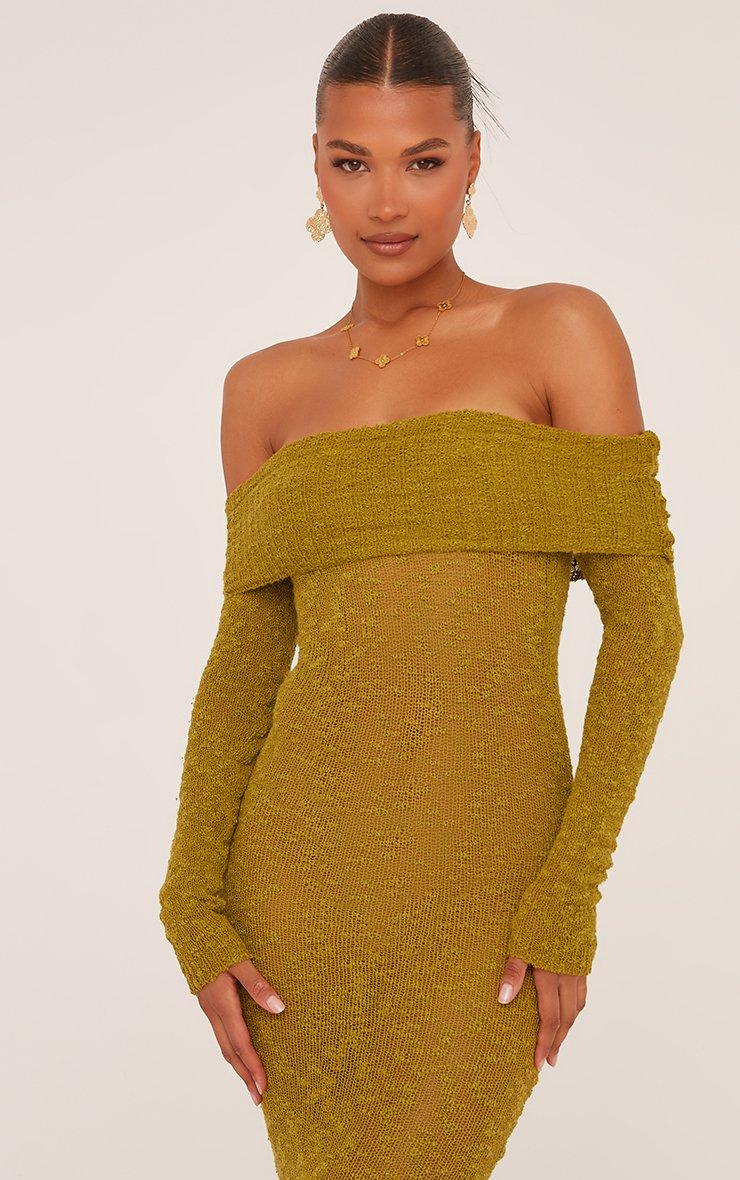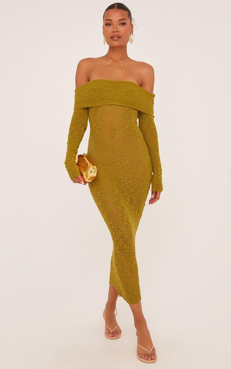 Fold Over Bardot Maxi Dress In Olive Green Textured Knit