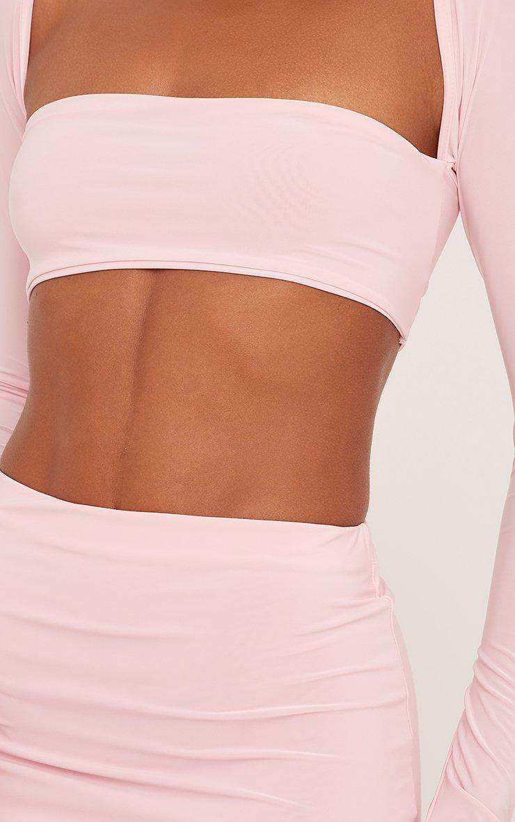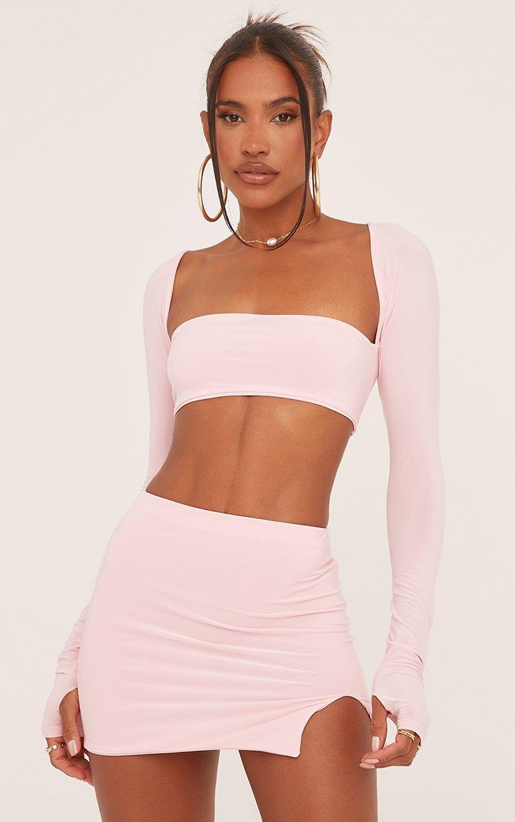 Long Sleeve Square Neck Crop Top And High Waist Mini Skirt Co-Ord Set In Pink Slinky