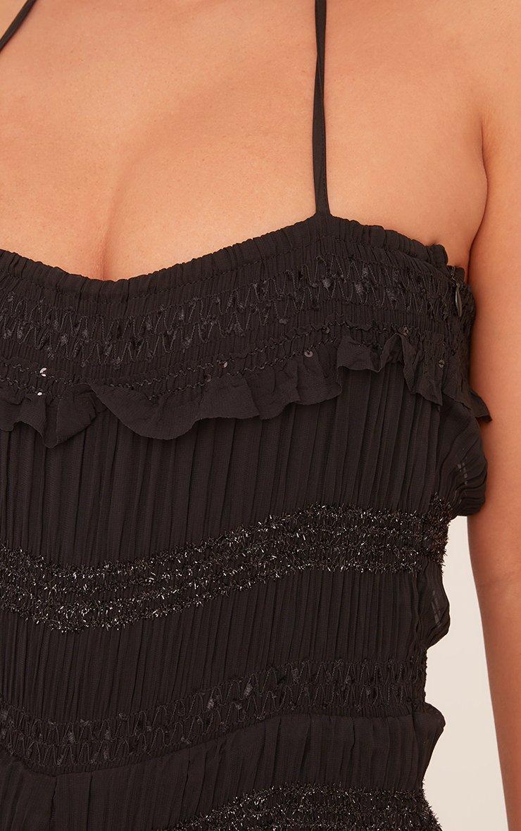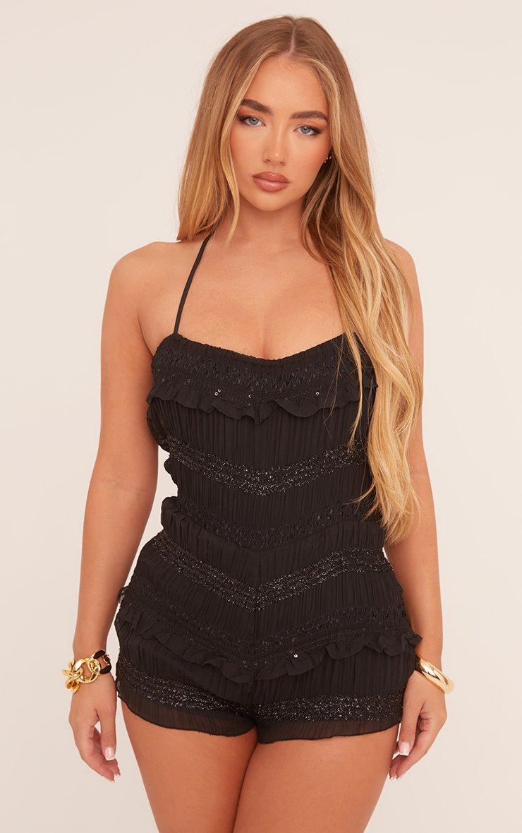 Ready to own the night? Featuring a textured black material with playful tiered frill detailing, this strappy playsuit is perfect for a night out.