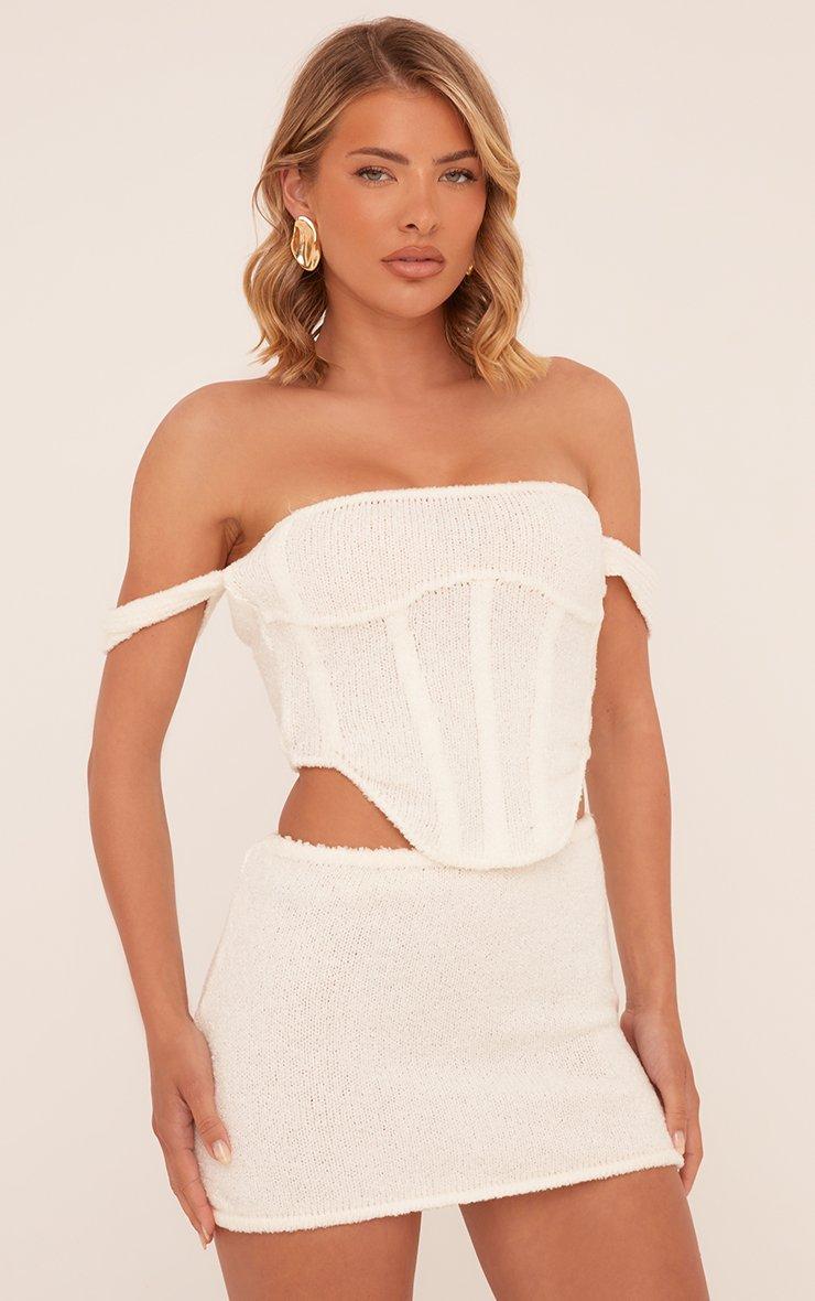 Loot effortlessly put together in this Mid Rise Mini Bodycon Skirt in Cream Boucle Knit. This cream knitted skirt is all about keeping it cute and cosy with its soft cream boucle knit and mid rise fit. The bodycon style shows off your flawless figure while the mini length is all about keeping is flirty. Pair with the matching corset for a knitted co -ord that’s designed to stand out!