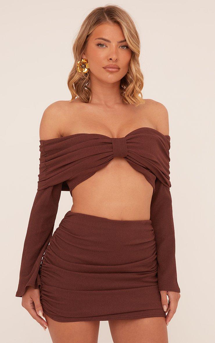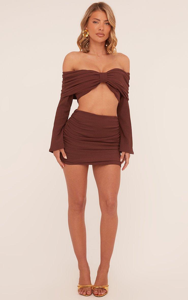 Get your glam on with this with this High Waist Ruched Side Mini Skirt In Brown Texture. With ruched side details, a high waist style and bodycon fit this brown mini skirt is all about enhancing your flawless figure. The rich brown textured fabric Is bringing all the luxe vibes with the mini length keeps it sexy. Pair this mini skirt with the matching crop top for a sickening vibe this weekend. We are obsessed!