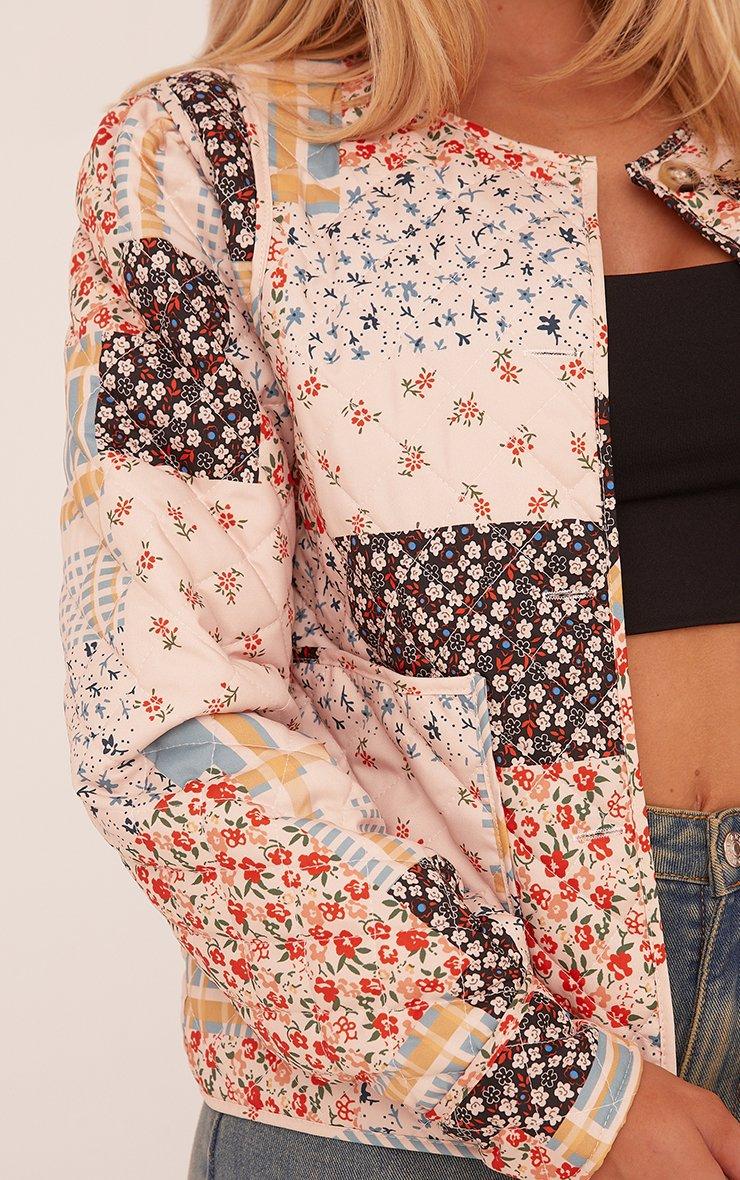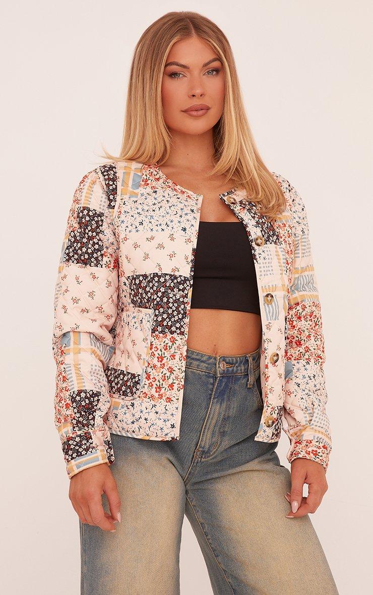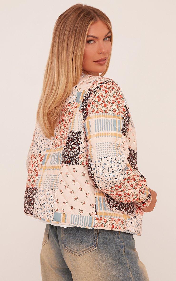 Patchwork Detail Quilted Bomber Jacket In White Multi Floral Print