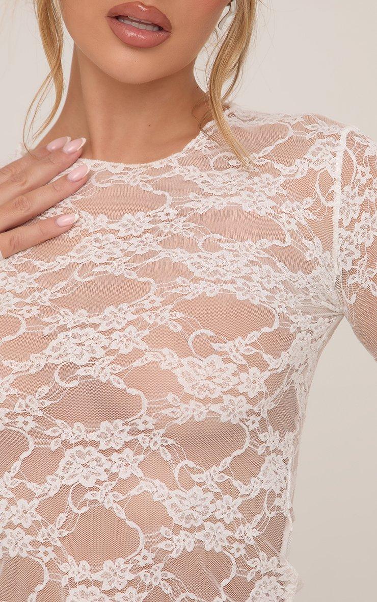 Long Sleeve Crew Neck Top In Cream Lace