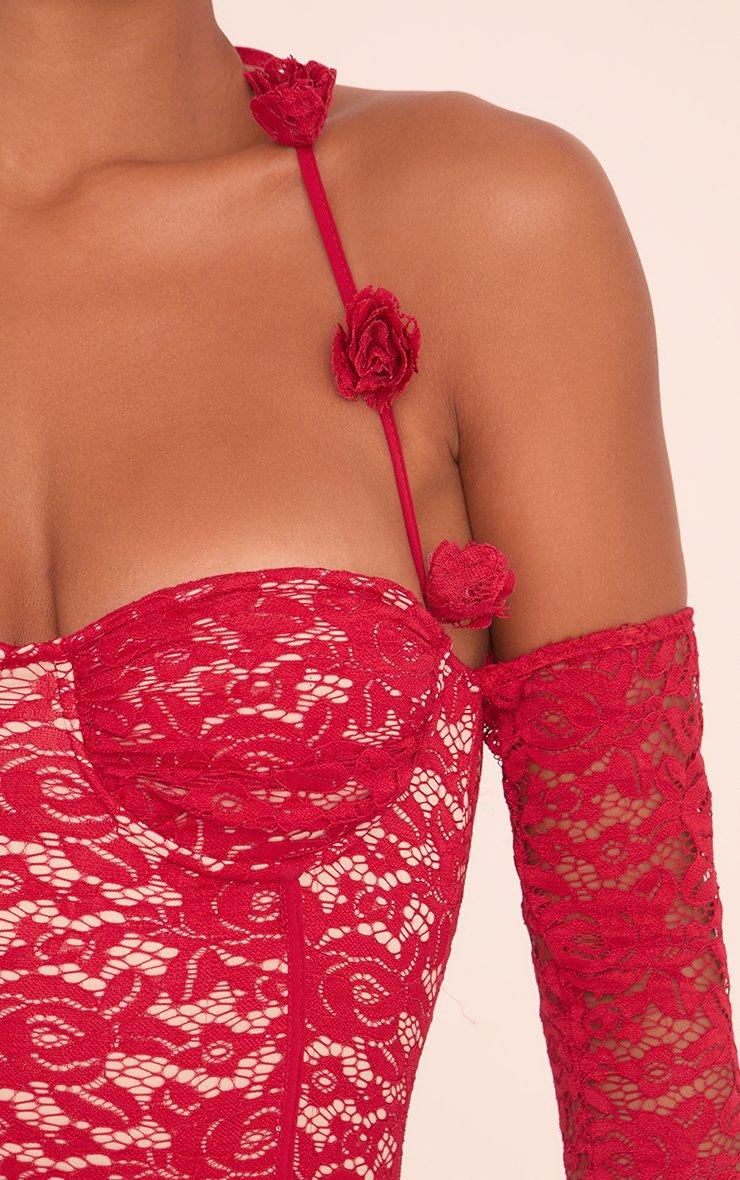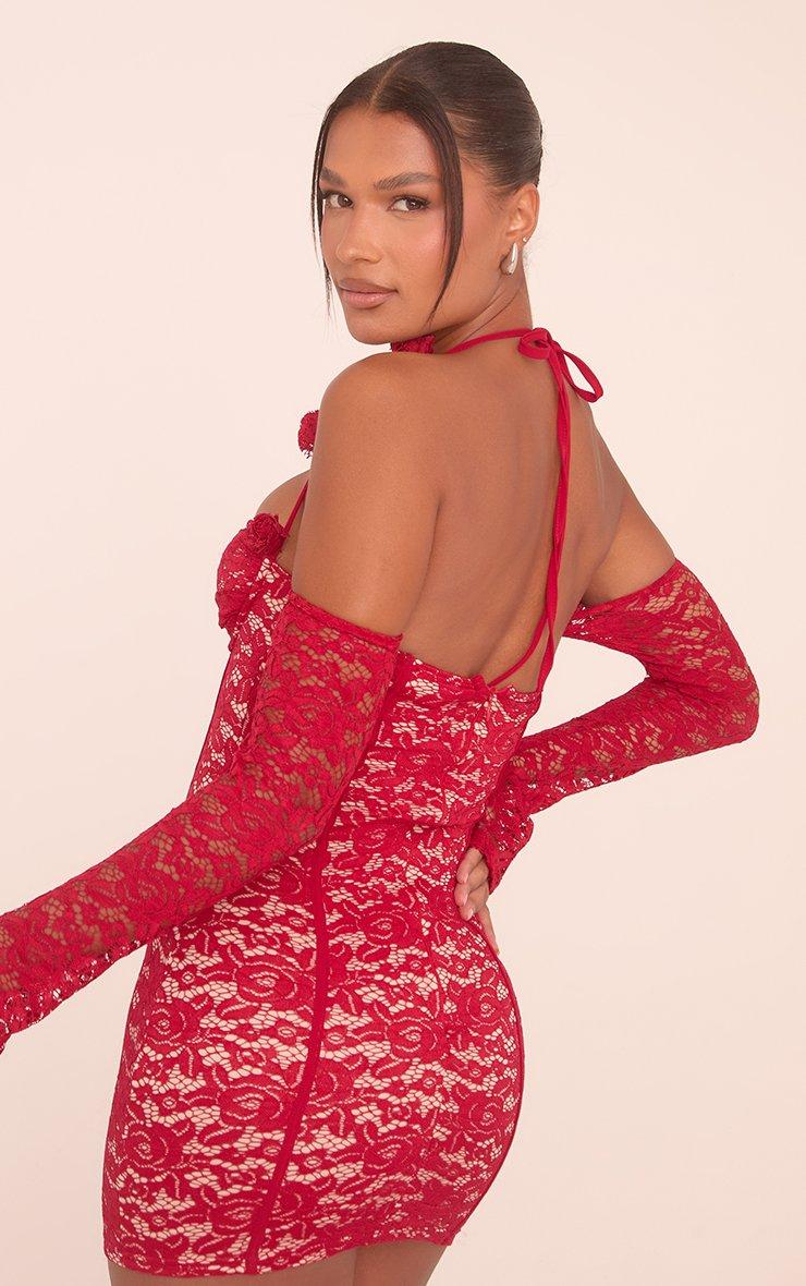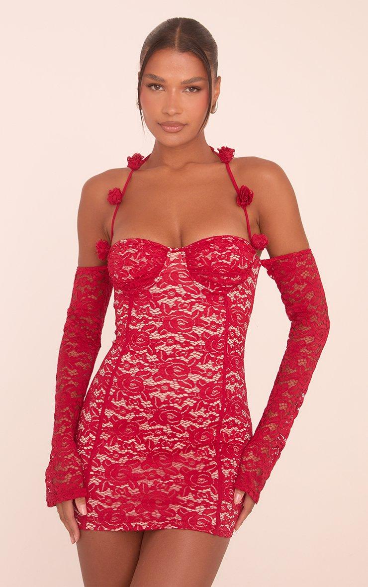 Rose Halterneck Detail Long Sleeve Cupped Mini Bodycon Dress In Red Lace