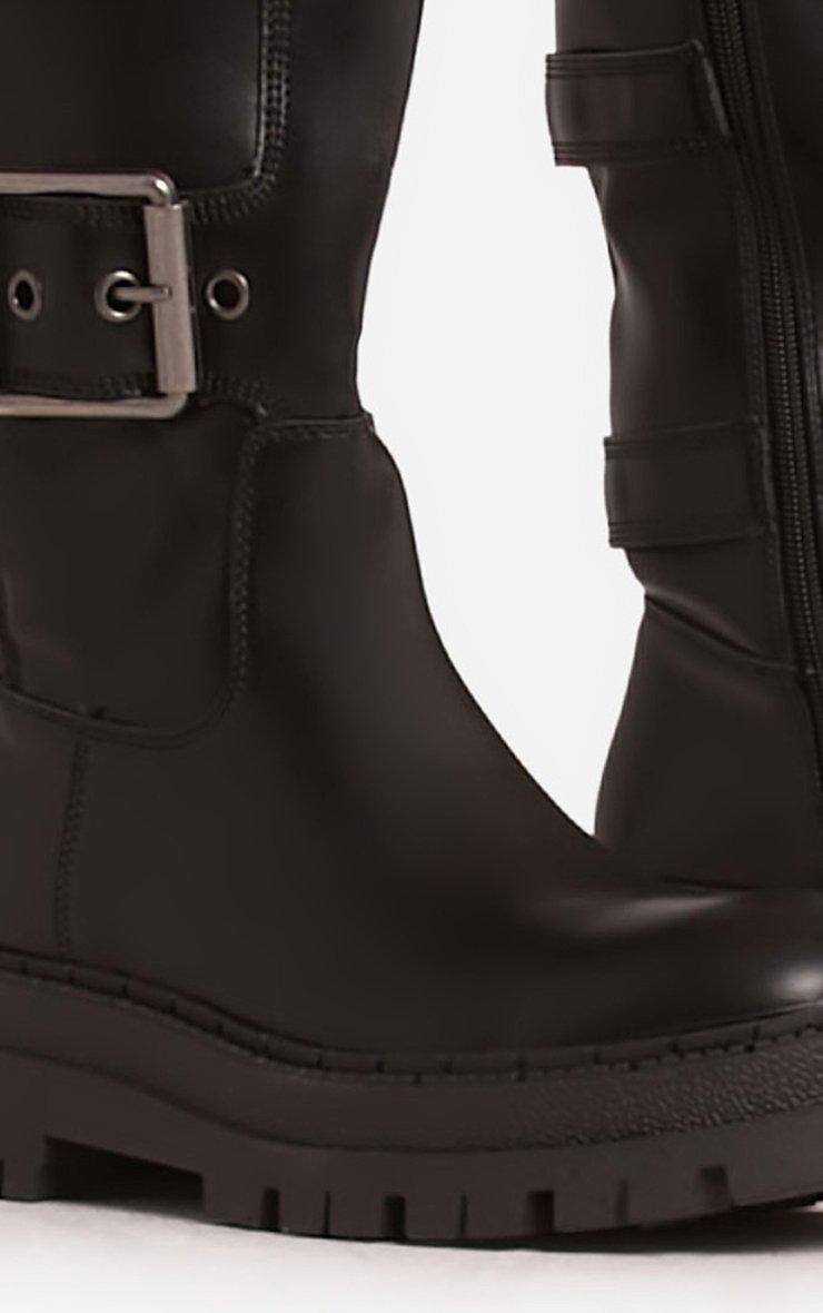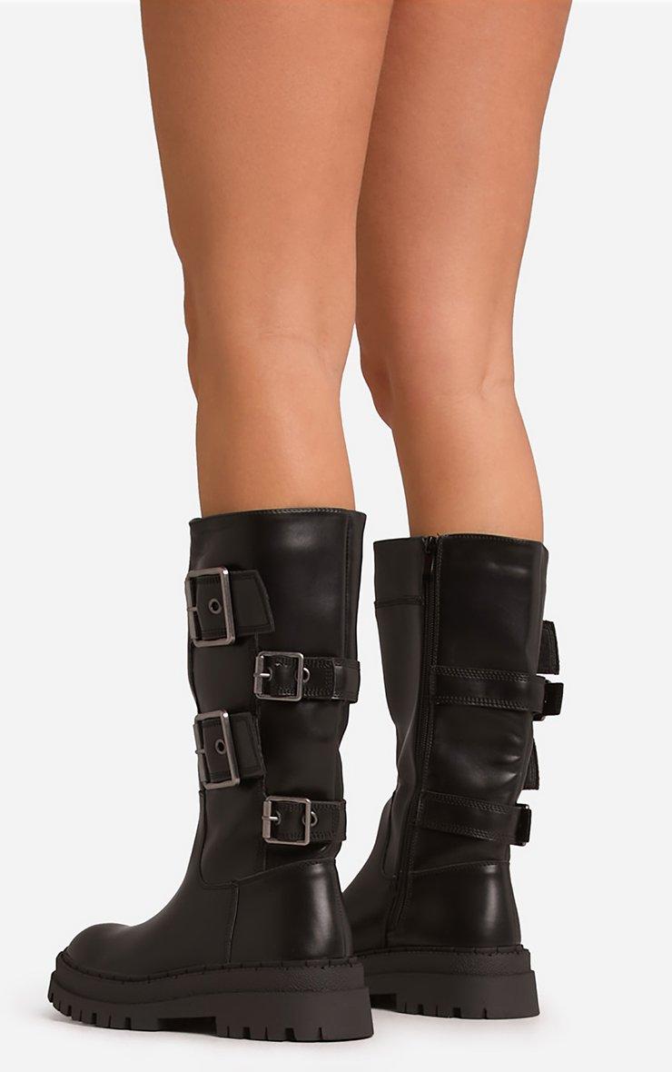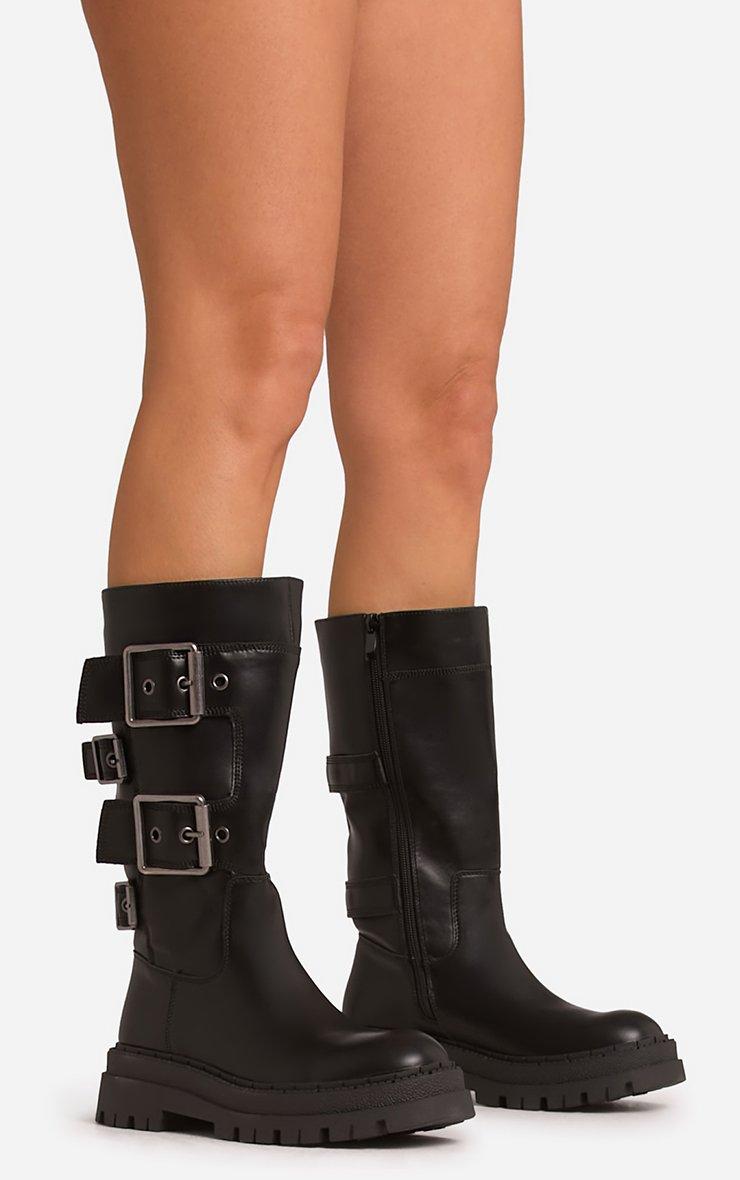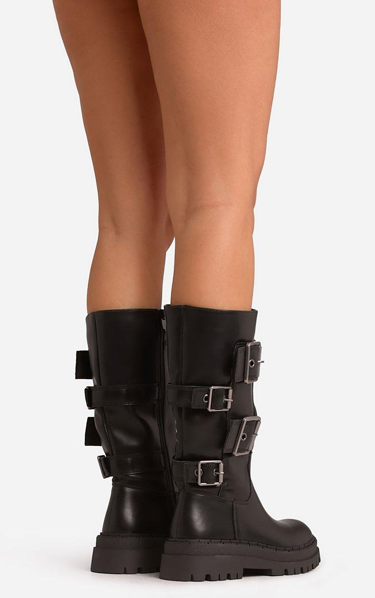 Kinley Buckle Detail Chunky Sole Mid Calf Biker Boots In Black Faux Leather