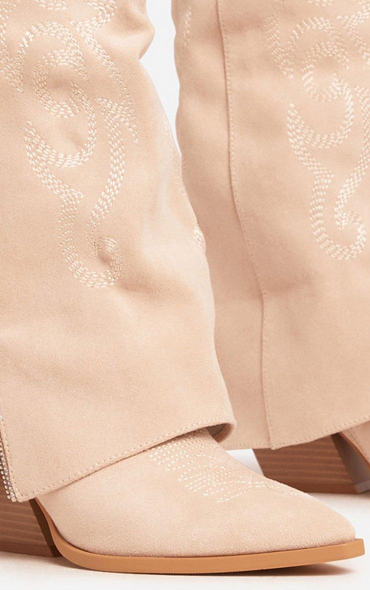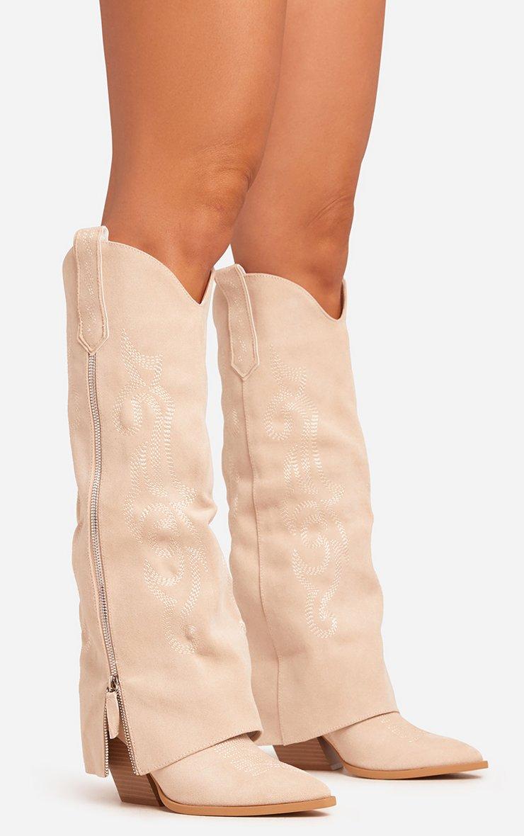 Vivian Embroidered Side Zip Detail Pointed Toe Knee High Western Cowboy Boot In Nude Faux Suede
