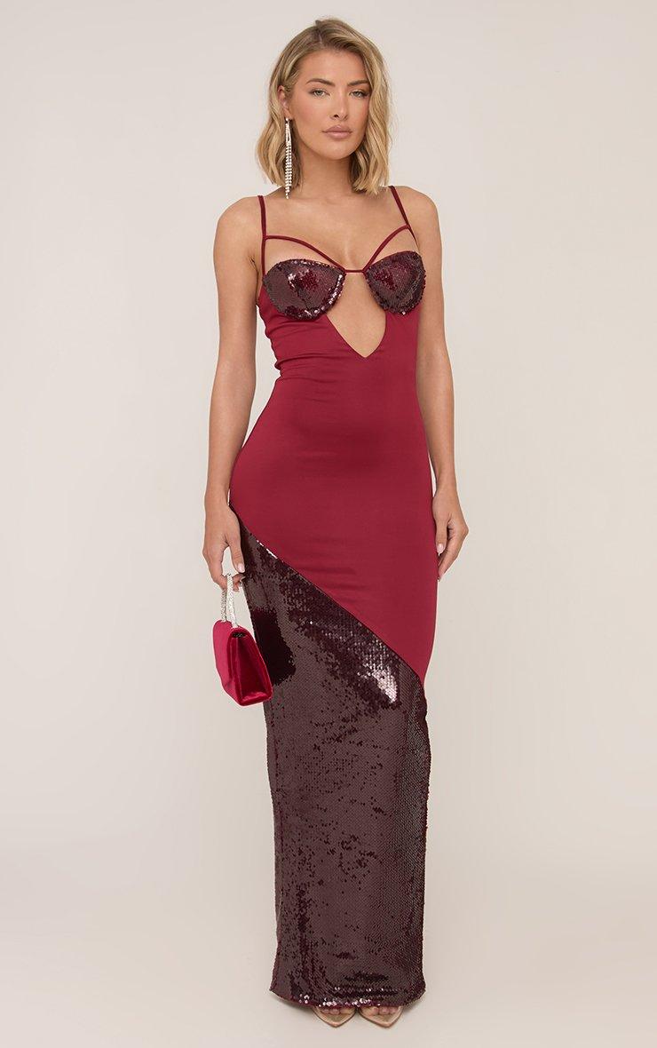 Cut Out Strappy Detail Contrast Sequin Panel Maxi Dress In Burgundy
