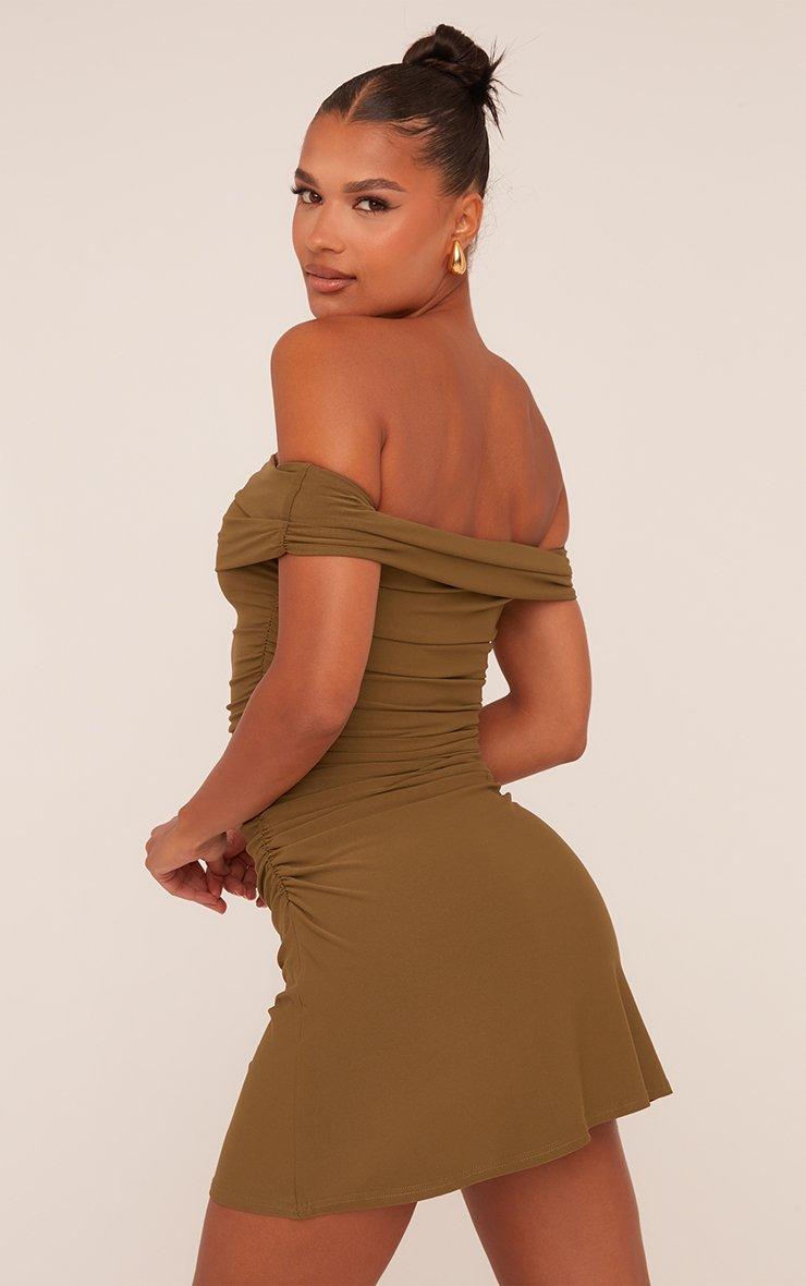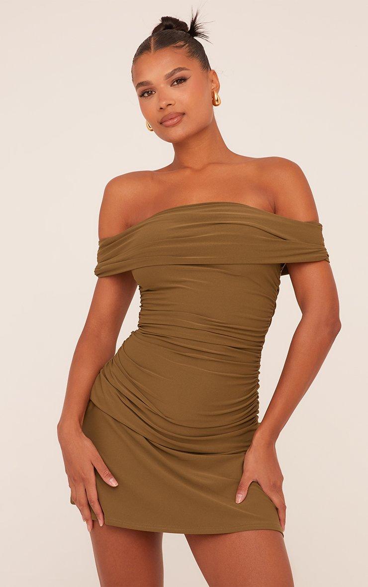 Level up your weekend vibe with this Bardot Flippy Hem Mini Dress in Khaki Green! This green bardot dress features a chic off-the-shoulder neckline and a playful flippy hem for those twirl-worthy moments. The khaki green color brings effortless cool-girl vibes, while the ruched details enhance your flawless figure. Pair this mini dress with strappy heels for a look that’s ready to steal the spotlight!