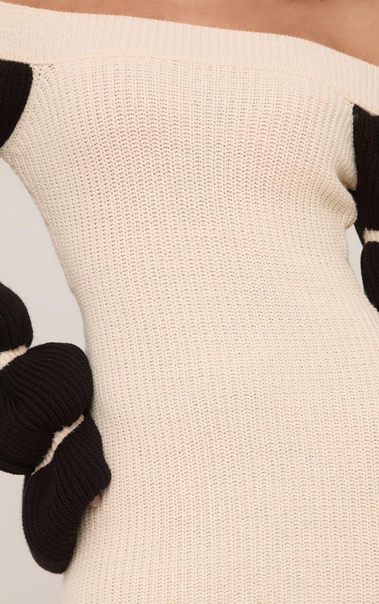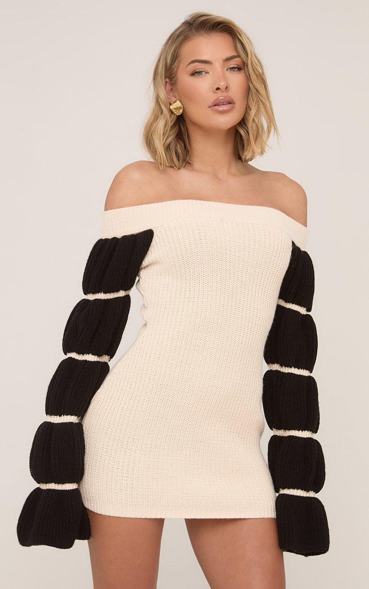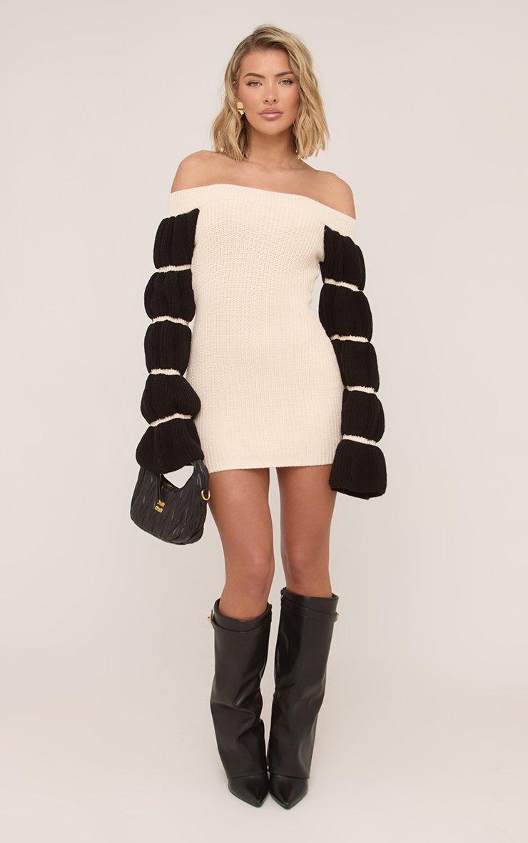 Bardot Contrast Puff Sleeve Mini Dress In Cream Knit
